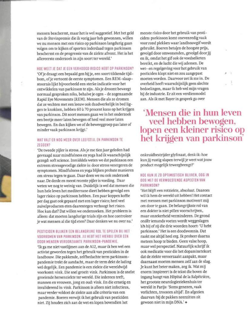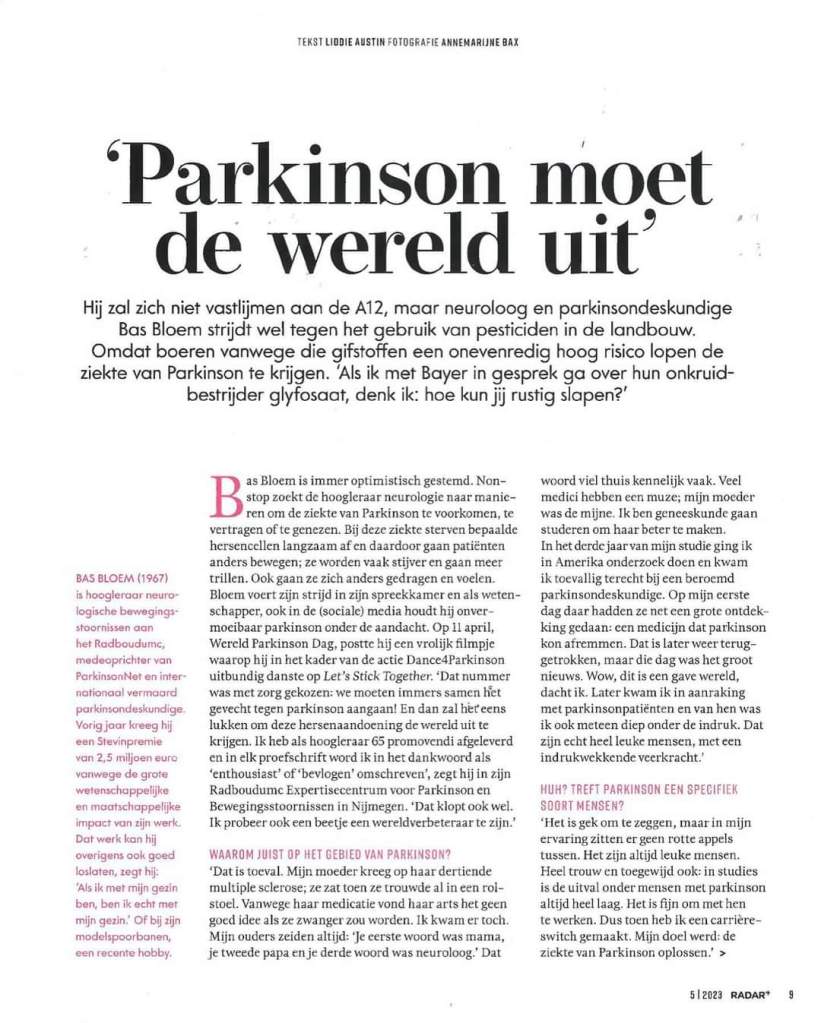 ‘Ook in Nederland neemt het aantal mensen met Parkinson snel toe. Inmiddels zijn er ruim 65.000 mensen met Parkinson of parkinsonisme in ons land. Als er geen actie wordt ondernomen verwachten wetenschappers dat het aantal mensen met parkinson in 2040 kan zijn verdubbeld. Mogelijk spelen gewasbeschermingsmiddelen, zoals #glyfosaat, en omgevingsfactoren een rol in het krijgen van parkinson’