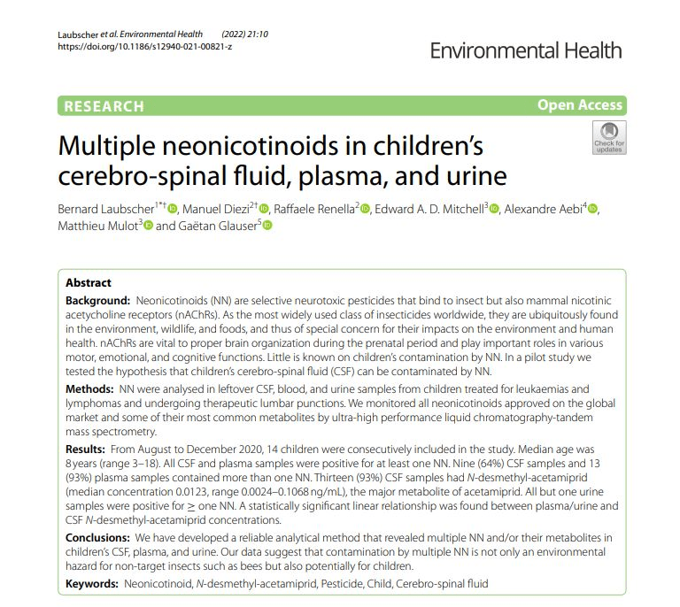 En dan te bedenken dat deze neurotoxische insecticiden waar we wereldwijd allemaal uitgebreid aan blootgesteld worden (https://lnkd.in/ekEuc-fh) ook zijn aangetroffen in hersenvocht van kinderen in Zwitserland (https://lnkd.in/epngdmnE) en in de urine van mensen in diverse landen (https://lnkd.in/e78YUYab)…….