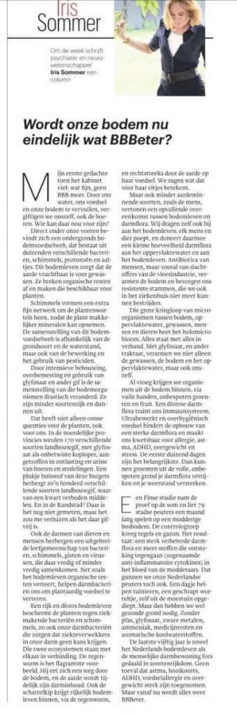 In haar column in Trouw wijst psychiater Iris Sommer op de verontrustende staat van onze landbouwgrond: in Noord-Nederland werden maar liefst 170 soorten pesticiden gevonden in de ontlasting van burgers. Dat gif tast niet alleen de bodem aan, maar ook ons darmmicrobioom – met gevolgen als ADHD, allergieën, overgewicht en stress.