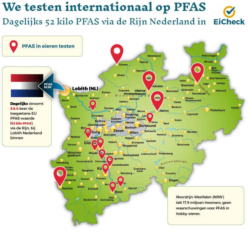 Uit meer dan 700 metingen in Nederland, gedeeld via pfasinkaart.nl, blijkt dat 60% van de geteste hobby-eieren zóveel PFAS bevat dat ze volgens Europese normen niet meer gegeten zouden mogen worden. En dat zijn vrijwel allemaal Nederlandse meetlocaties. Maar gezien de grote hoeveelheid PFAS die dagelijks via de Rijn uit Duitsland ons land binnenkomt, is het aannemelijk dat hobby-eieren in Noordrijn-Westfalen (NRW) vergelijkbare waarden zullen laten zien.
