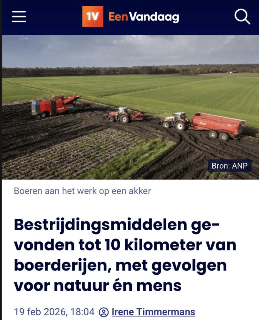 Het onderzoek van Wageningen University & Research waar EenVandaag over bericht, laat zien dat bestrijdingsmiddelen tot op 10 kilometer van landbouwpercelen worden teruggevonden. Tien kilometer. Dat betekent dat niemand zich nog kan verschuilen achter het idee dat dit alleen “op het platteland” speelt. We zitten allemaal in dezelfde gifbubbel.