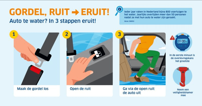 1️⃣ Gordel los – Maak je gordel direct los. Zit hij te strak, aan de veiligheidshamer zit ook een mes verzonken om de gordel in dit geval door te snijden 2️⃣ Ruit open – Open het raam zo snel mogelijk. Werkt het niet? Gebruik een veiligheidshamer. Vaak zinkt als eerste de voorkant, dan kan je ook proberen op de achterbank te komen, en met beide voeten het achterraam eruit te drukken 3️⃣ Eruit! – Ga meteen naar buiten via het raam. Help anderen pas als jij veilig bent
