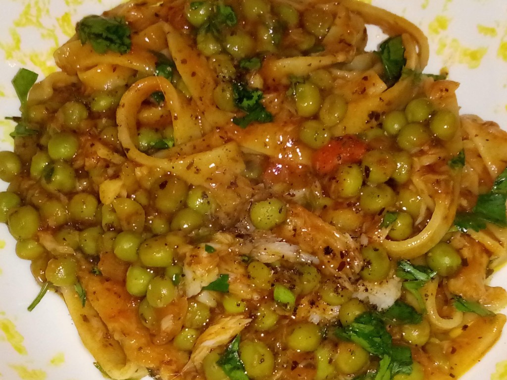 2 verse gerookte haring (mogen ook gerookte of verse makrelen zijn), 400 gram verse doperwten (of diepvries), 150 gr tagliatelle of pappardelle, 1 teentje geperste knoflook, extra vergine olijfolie, 100 ml gezeefde tomaten, handje verse munt, fijngehakt handje marjolein, fijngehakt handje verse peterselie, zout, zwarte peper