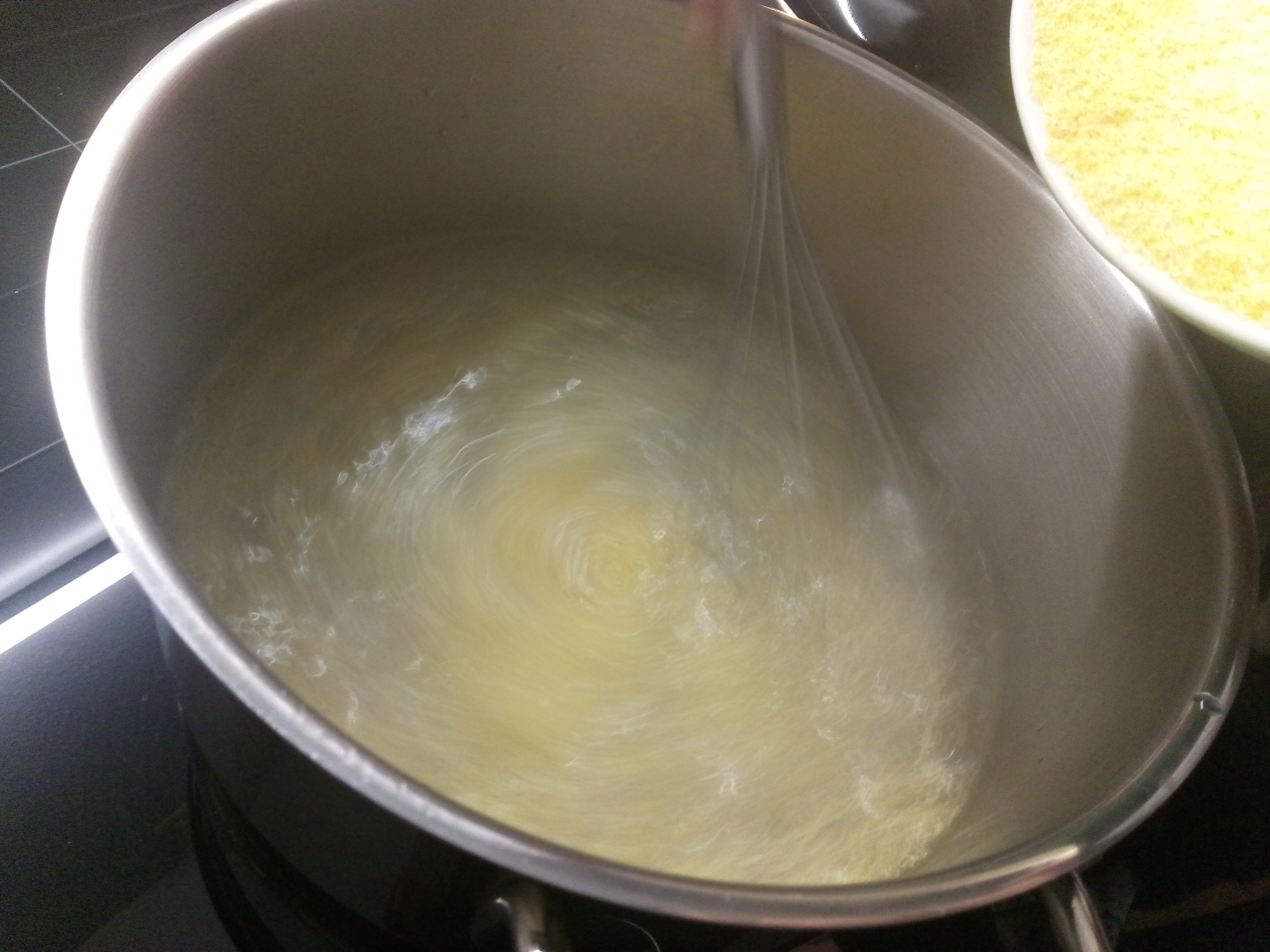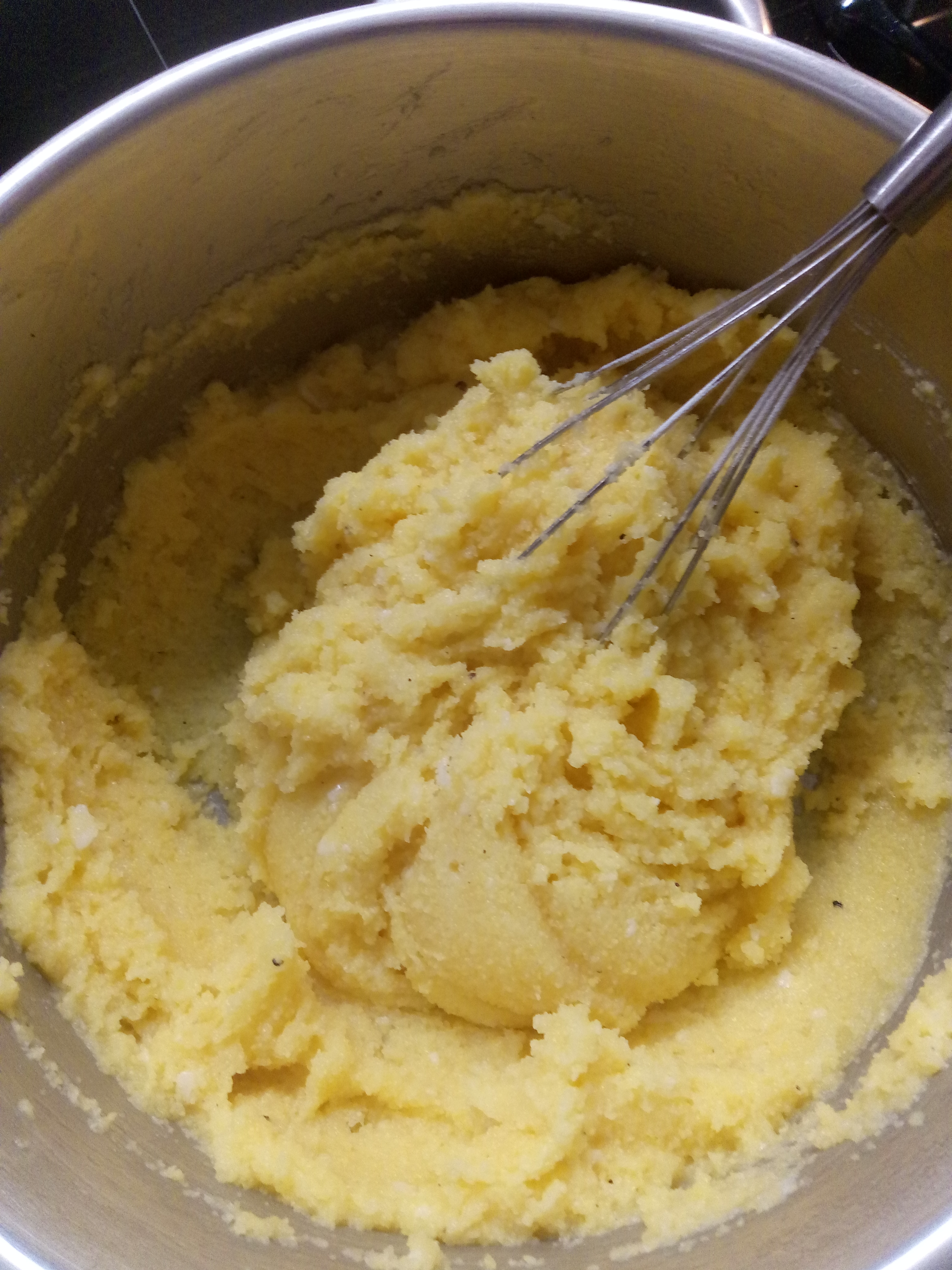 Polenta: voor 4-6 personen 250 gr polenta, 100 gr roomboter (mag ook minder), handvol geraspte Parmezaan, zout, zwarte peper