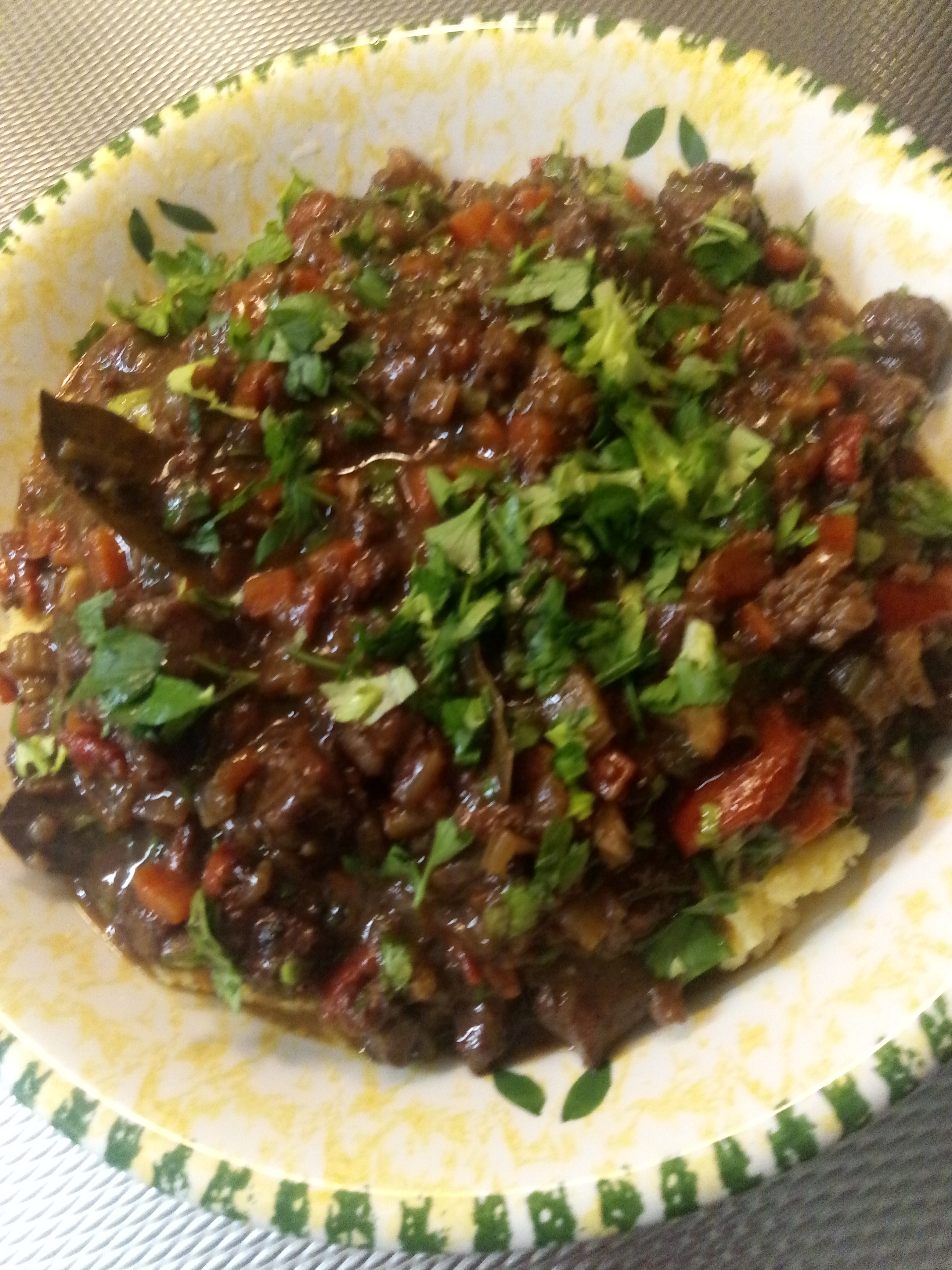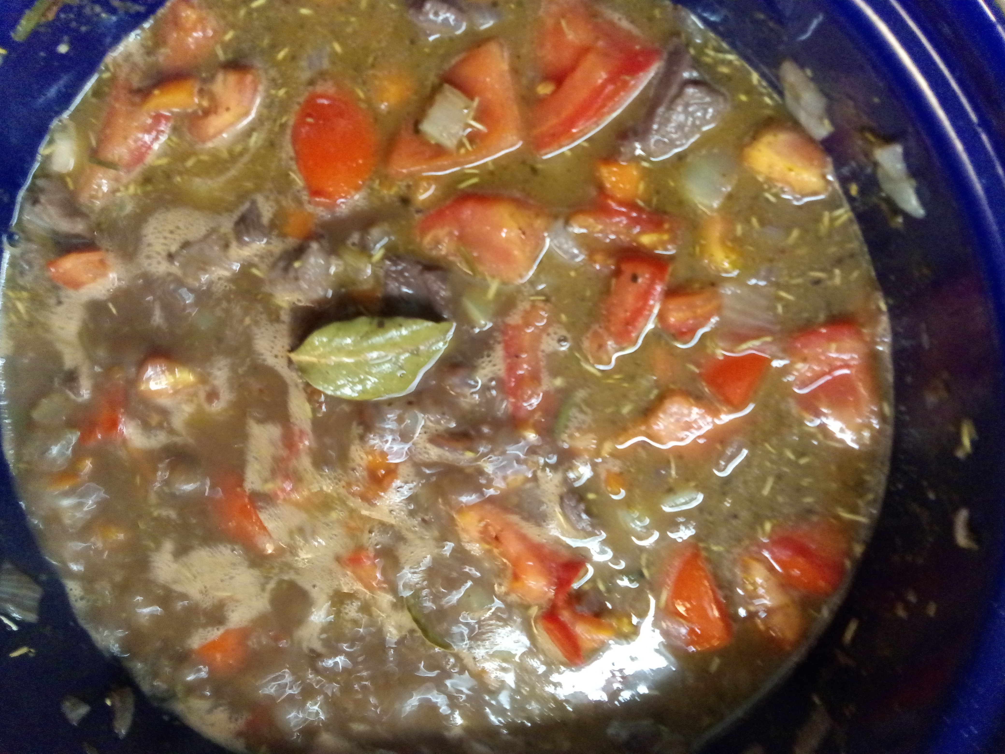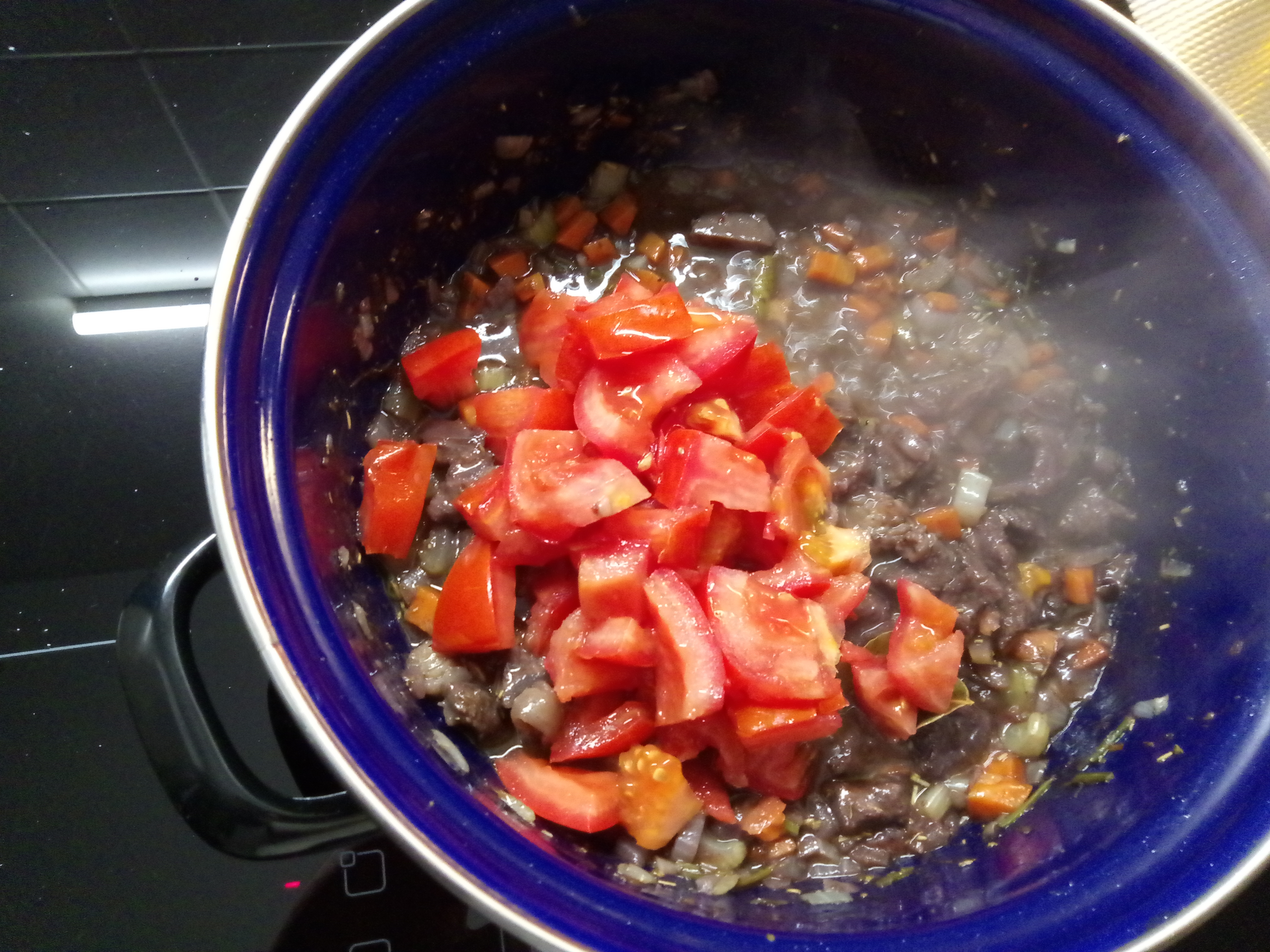 Doe het vlees bij de groenten in de pan en als de groenten zacht zijn bak je alles voor 5 min op hoog vuur. Doe dan de wijn erbij en laat inkoken. Doe dan de in stukjes gesneden tomaat en groente bouillon erbij. Leg de deksel op de pan en laat op laag vuur voor 3 uur stoven. Kijk regelmatig of het geheel niet te droog wordt, doe er dan wat warm water bij. Proef het vlees of het gaar is, uit elkaar valt. Maak ongeveer 40 min voor het einde van de stooftijd de polenta.