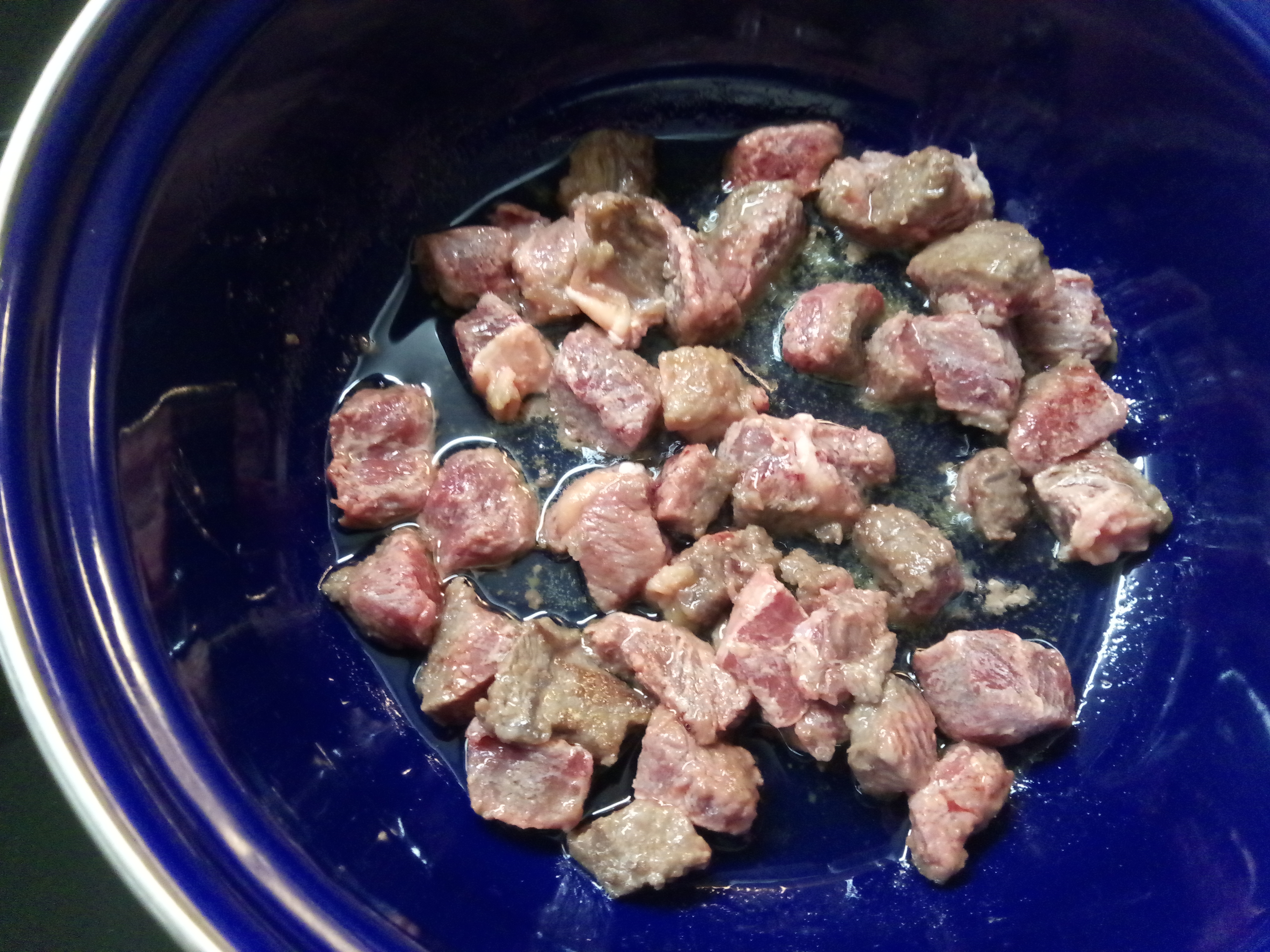 Snijd het vlees in blokjes en bestuif ze rondom met wat bloem. Bak ze in een braadpan waar alles in past in de olijfolie op middelhoog vuur rondom bruin. Neem het uit de pan en zet apart, laat de olie en het vocht van het vlees in de pan..