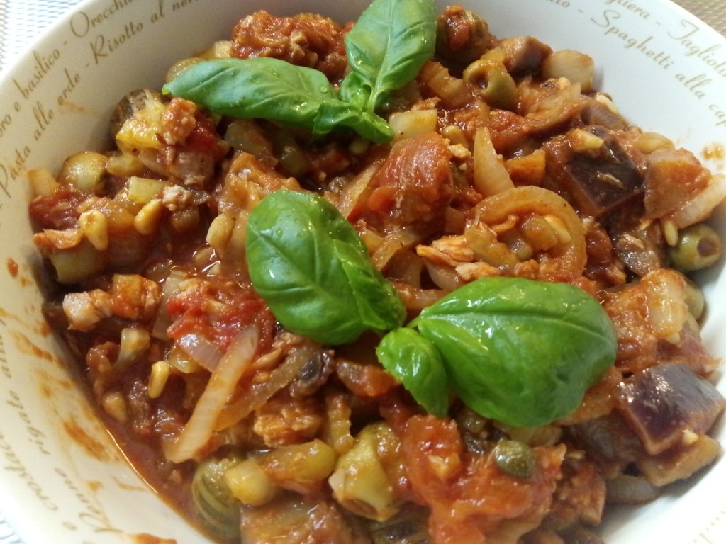 1 aubergine, 5 stengels bleekselderij, 2 uien, 2 knoflook, 2 el pijnboompitten, 6 el extra vergine olijfolie, 400 gr verse tomaten, 4 el groene olijven, 4 el zwarte olijven, 2 el kappertjes, 2 el rozijnen, 1 el suiker, 4 el balsamico, 15 gr basilicum, 2 stukken stokbrood of pasta naar eigen idee
