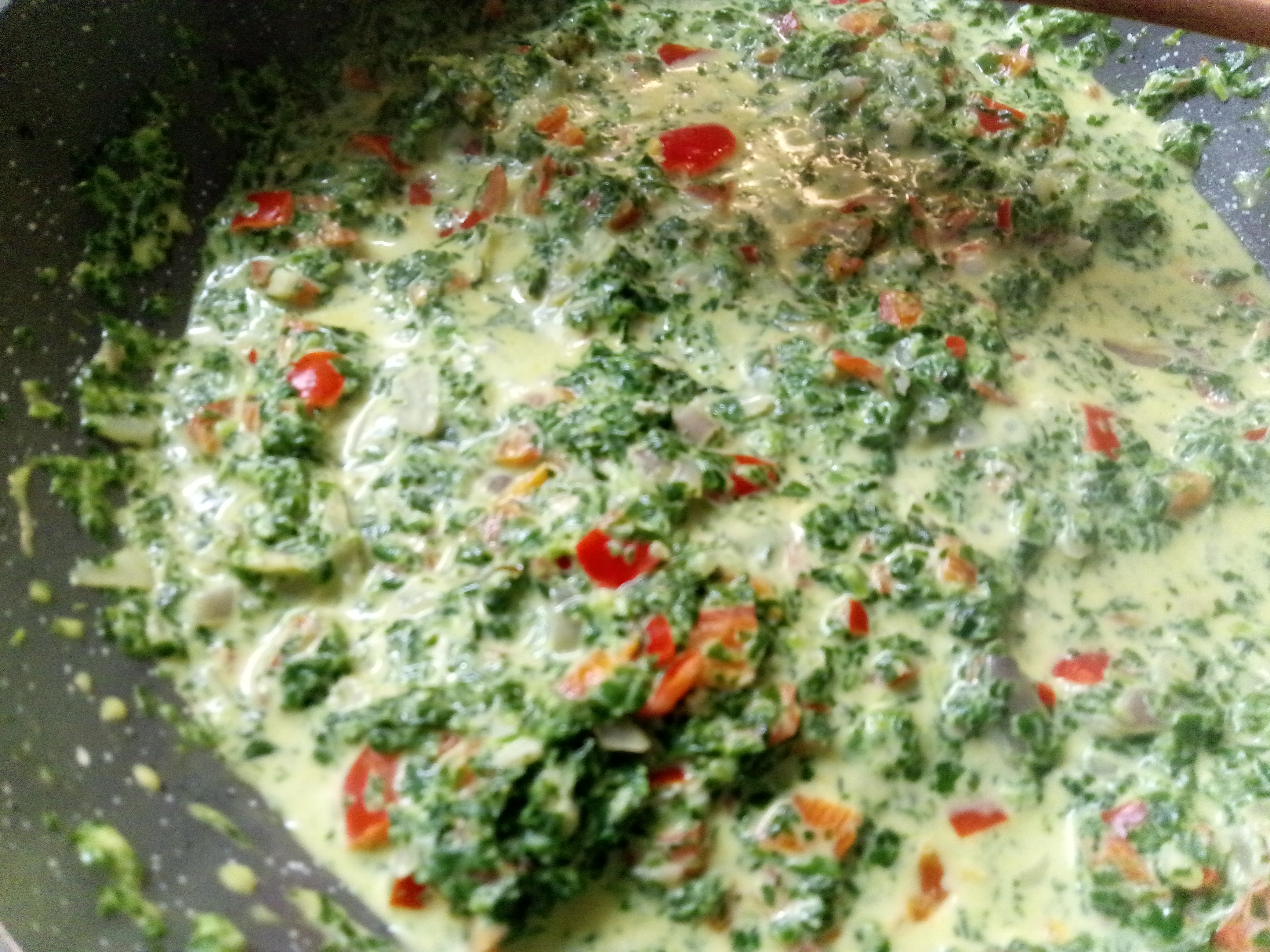 200 gr spinazie (vers of uit de diepvries), 1 ui, 2 knoflook, 1/2 rode paprika, 2 el gorgonzola, 4 el room, zout, zwarte peper, extra vergine olijfolie, Parmezaan