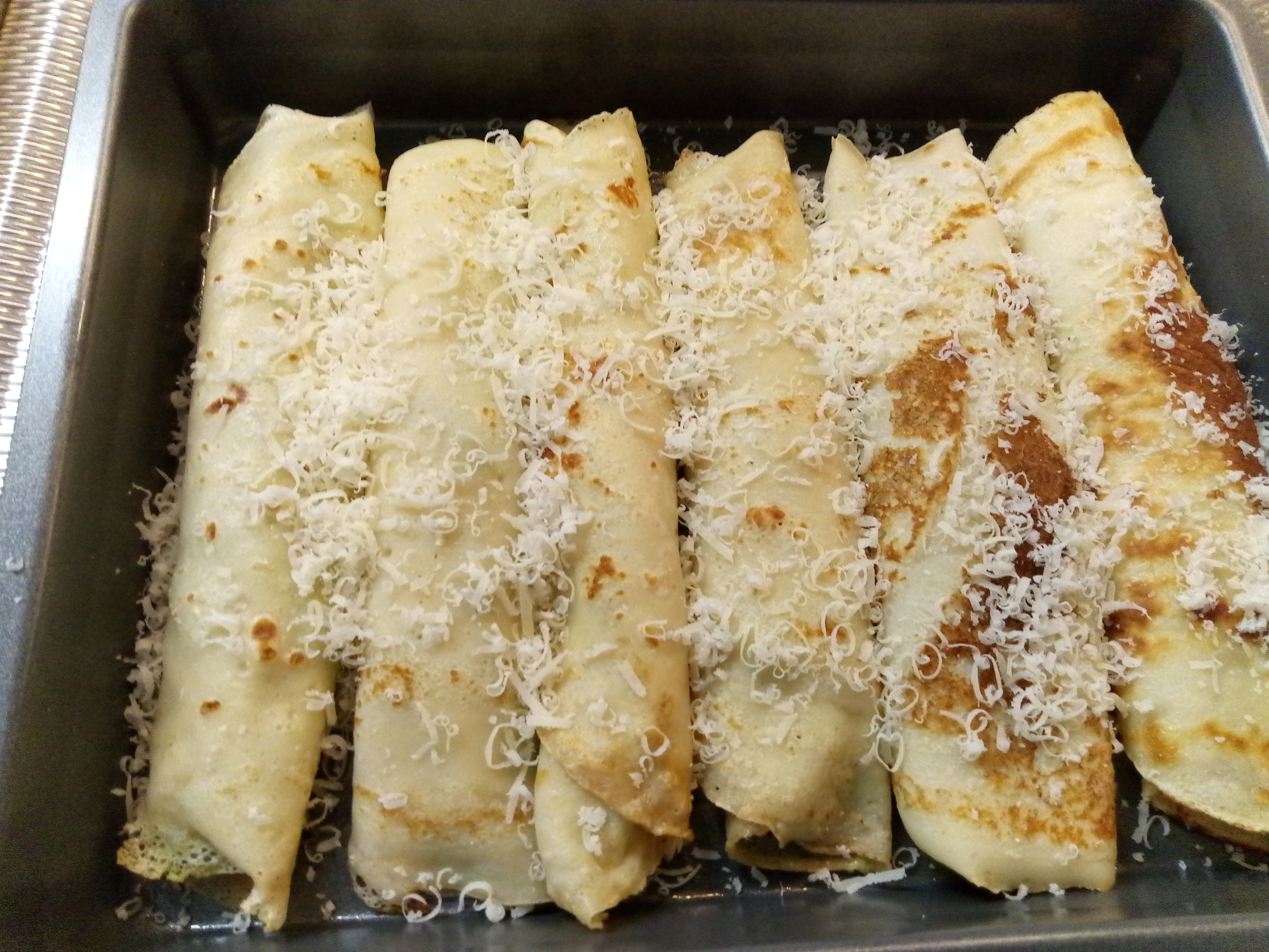 Snij de ui, knoflook en paprika fijn. Was de spinazie (of gebruik ontdooid uit de diepvries) en snijd deze ook fijn. Bak de ui, knoflook en paprika in een kleine koekenpan op middelhoog vuur (zorg dat de extra vergine olijfolie niet verbrand). Zodra de knoflook begint te ruiken voeg je de spinazie toe en bak deze enkele minuten mee. Maak op smaak met zout en zwarte peper. Voeg hierna de room en gorgonzola toe en laat de room inkoken. Verwarm de oven ondertussen voor op 180 gr. Als het mengsel de juiste dikte heeft ga je elke pannenkoeken met een laagje vullen en rol je de pannenkoek op. Leg de opgerolde pannenkoeken in de ovenschaal, bestrooi met Parmezaan en zet voor 15 min in de oven. Dien direct op.