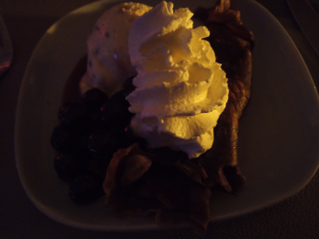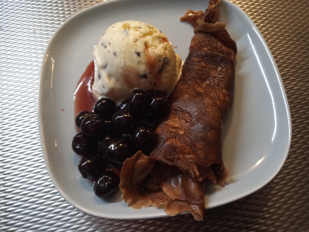 Voor 6-10 chocolade pannenkoeken, afhankelijke van de grootte van de koekenpan, 120 gr chocolade bloem (je kan ook gewone bloem nemen en zelf cacao toevoegen, kijk voor hoeveel op de verpakking of zelf chocolade smelten en door het beslag doen) , 240 ml melk, 1 ei, roomboter, 1 pot Amarena frutto & sciroppo, 1 bak stracciatella roomijs, slagroom