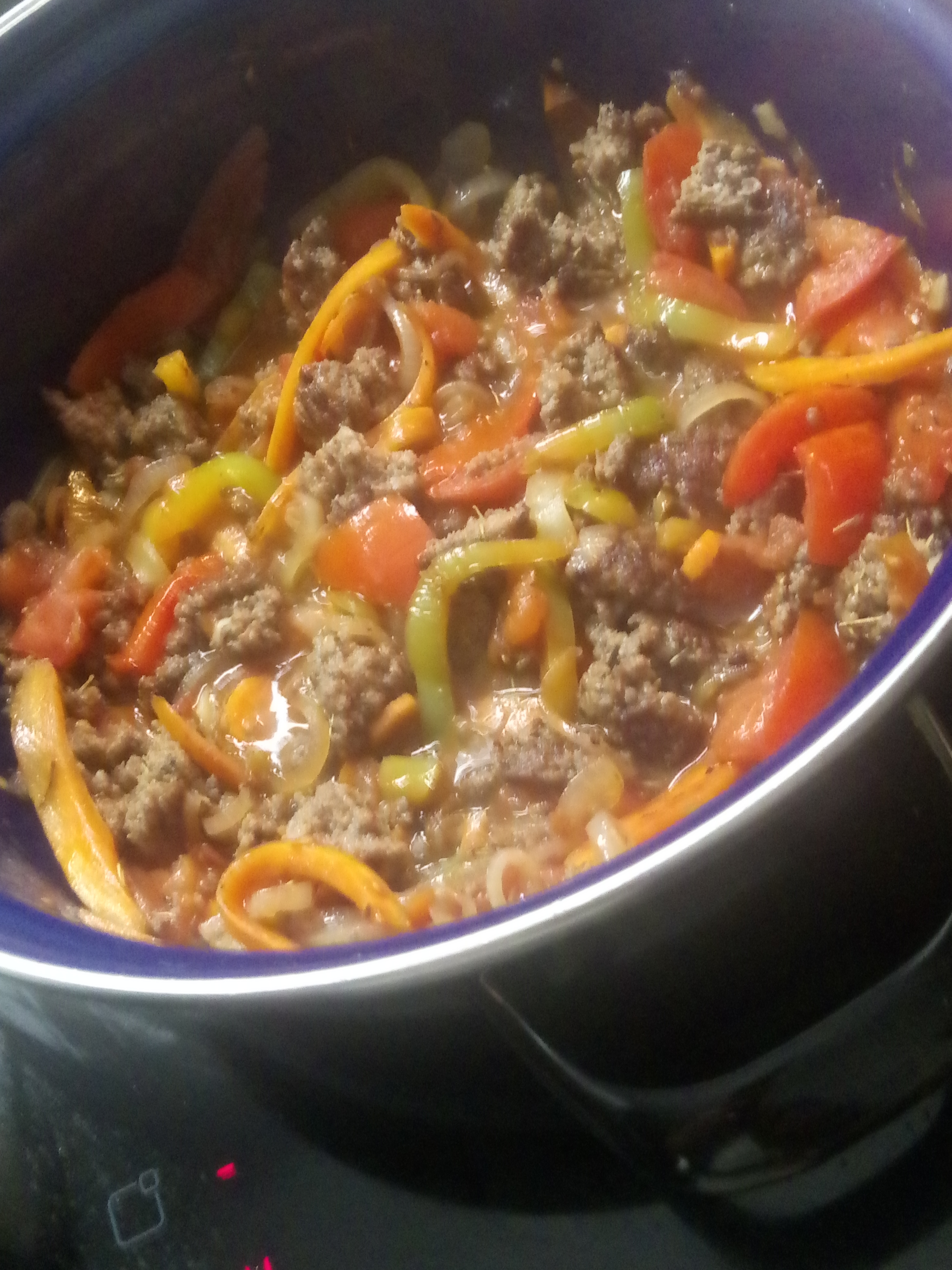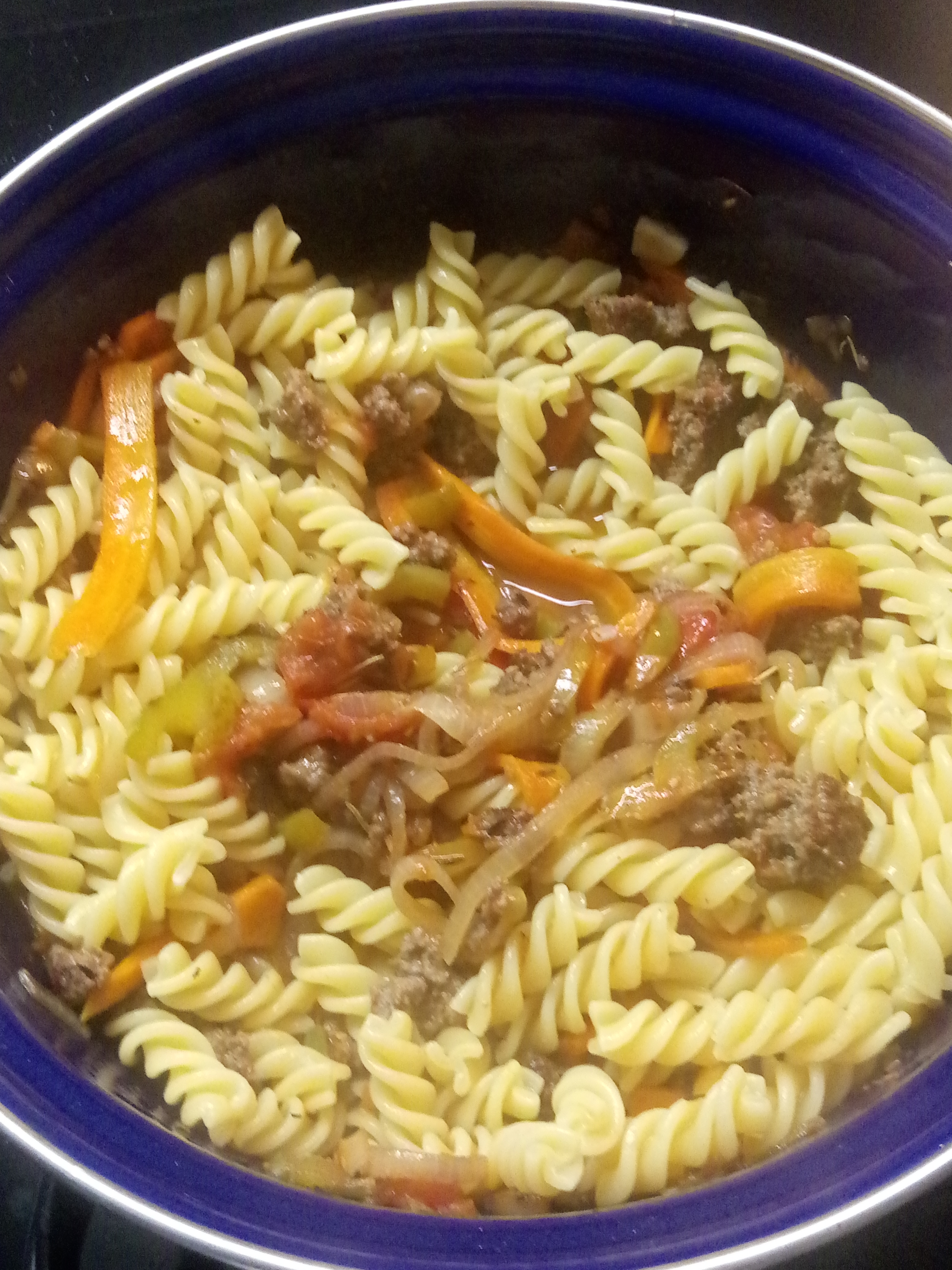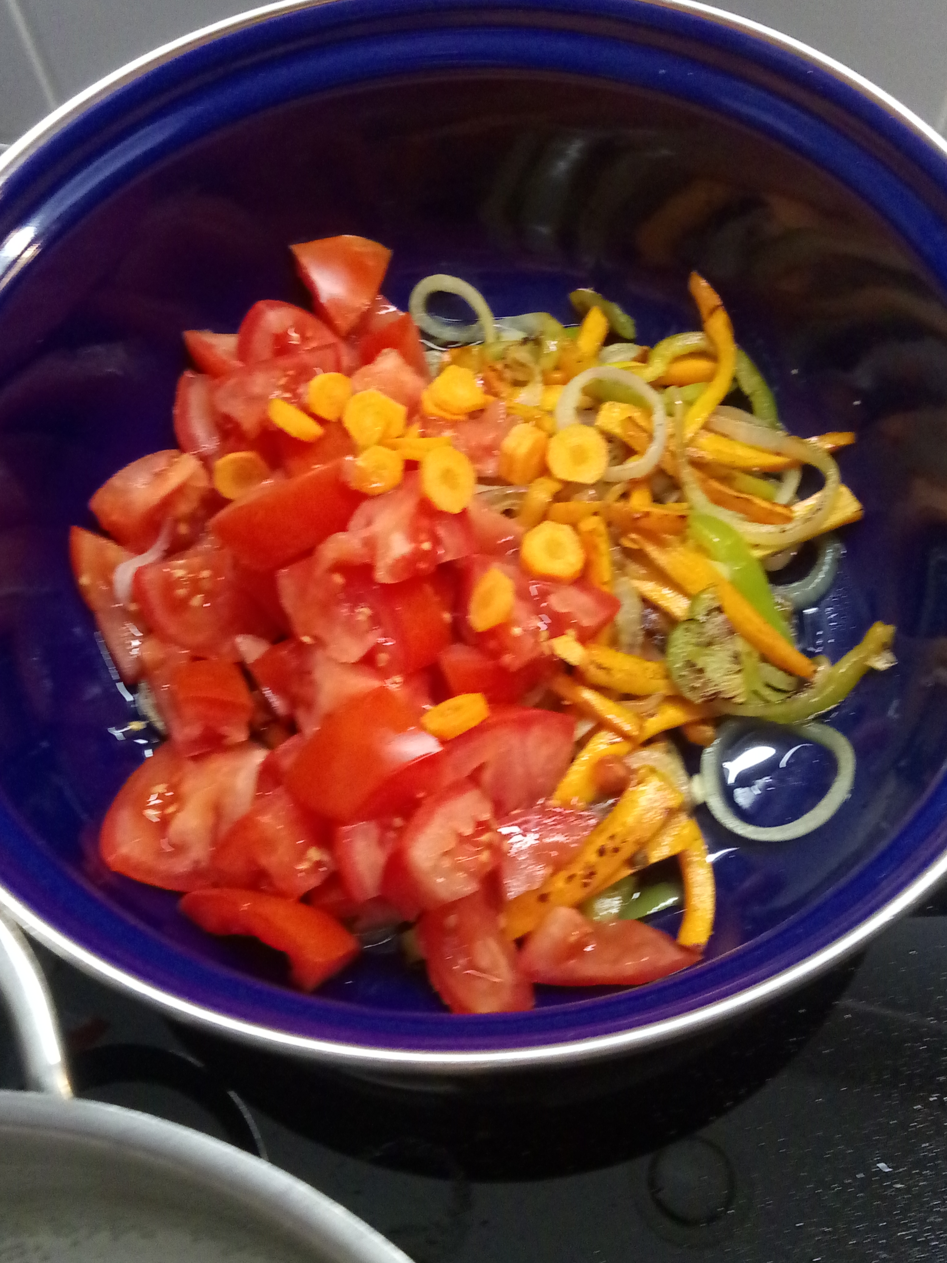 200 gr rundergehakt, 150 gr Fusilli, 1 ui, 2 knoflook, 2 wortelen, 1/2 groene paprika, 2 grote rijpe tomaten, rozemarijn, tijm, peper, zout, olijfolie, extra vergine olijfolie, balsamico, 1 glas rode wijn, 1 borrelglaasje Brandy + 1 voor de kokkie, Parmezaan