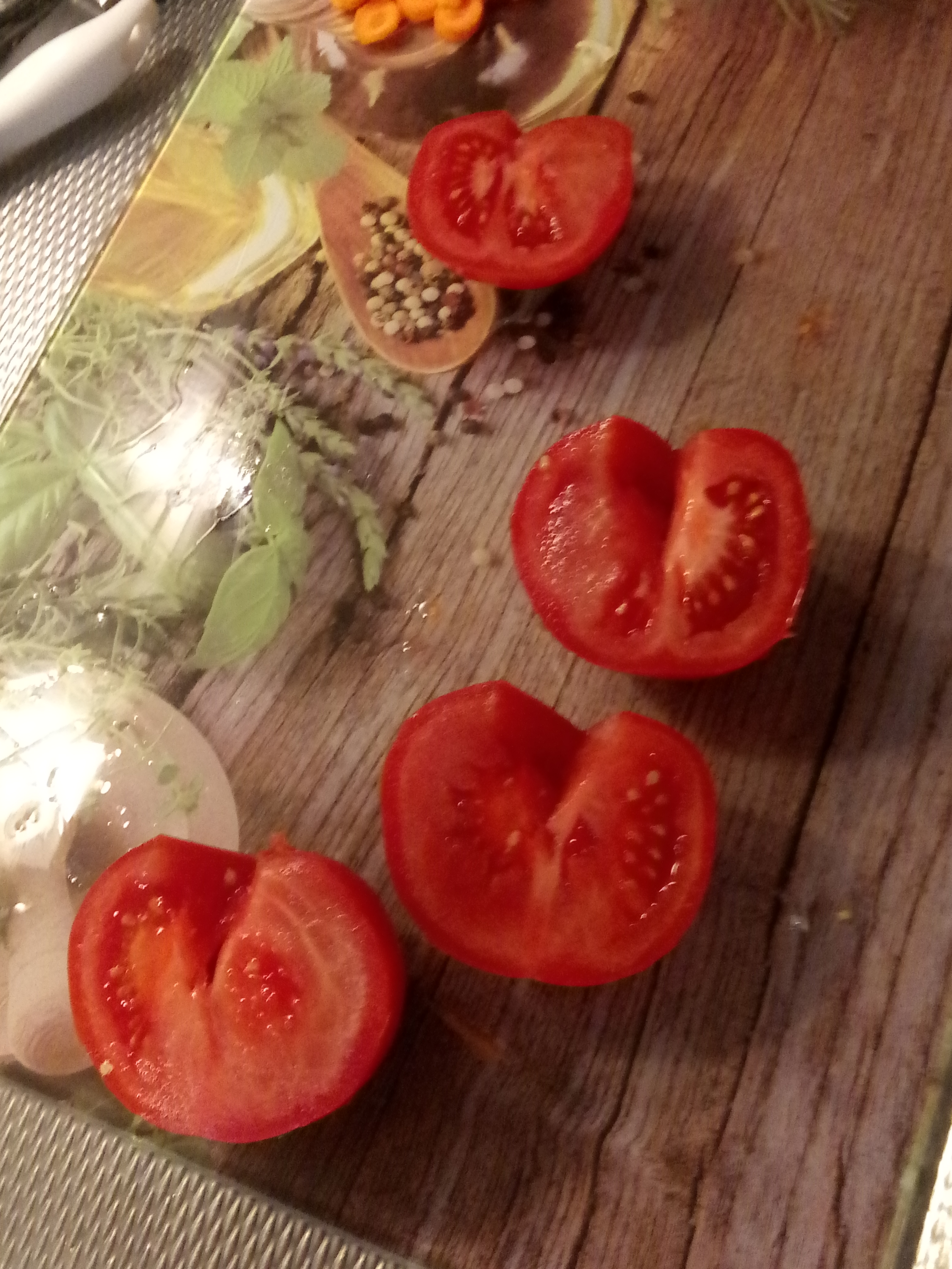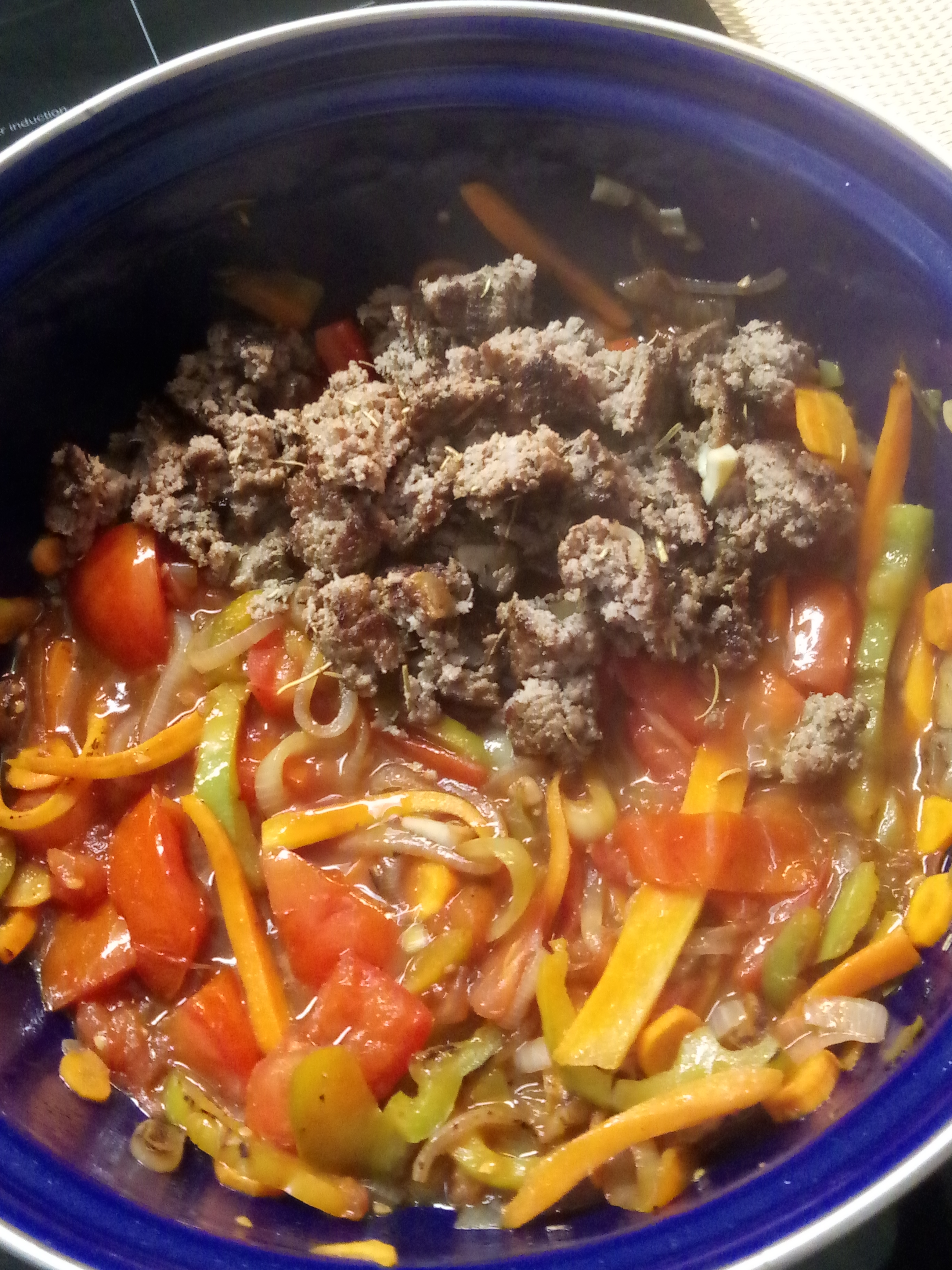 Snijd ondertussen ook het gehakt in grove stukken en voeg bij de tomaten/gegrilde groenten mengsel, laat lekker mee sudderen. Zodra de pasta klaar is doe je die erbij en hussel het geheel rustig door elkaar anders worden ze dronken. Doe in een mooie schaal, Parmezaan op je bord erbij en smullen maar………… met een heerlijk glas wijn.