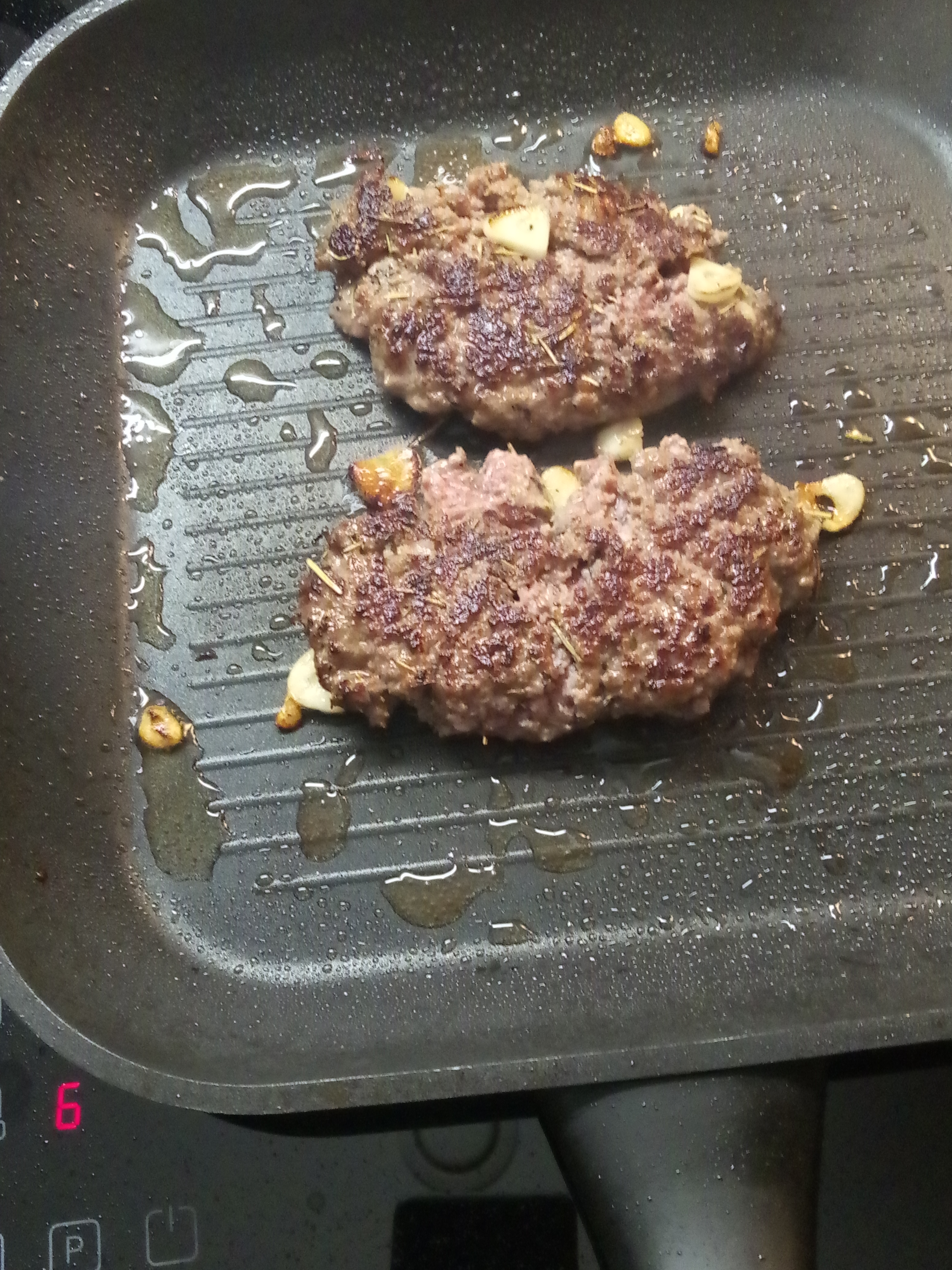 Doe in olijfolie in een braadpan en zet nog niet op het vuur, maar doe wel de gegrilde groenten er alvast in. Snijd de tomaten in stukken en voeg die erbij. Zet de grillpan weer op het vuur en laat heel heet worden. Leg nu het platte gehakt erin en grill aan beide zijden donkerbruin zodat er een stevige korst op komt. Houd het vuur hoog en blus het gehakt, nadat je zelf de Brandy geproefd hebt 😉 , met de Brandy (sound of the Kitchen, tsssss). Laat de alcohol (zonde) verdampen. Haal het gehakt uit de pan en leg op een snijplank. Doe de overgebleven saus in de braadpan bij tomaat/groente mengsel.