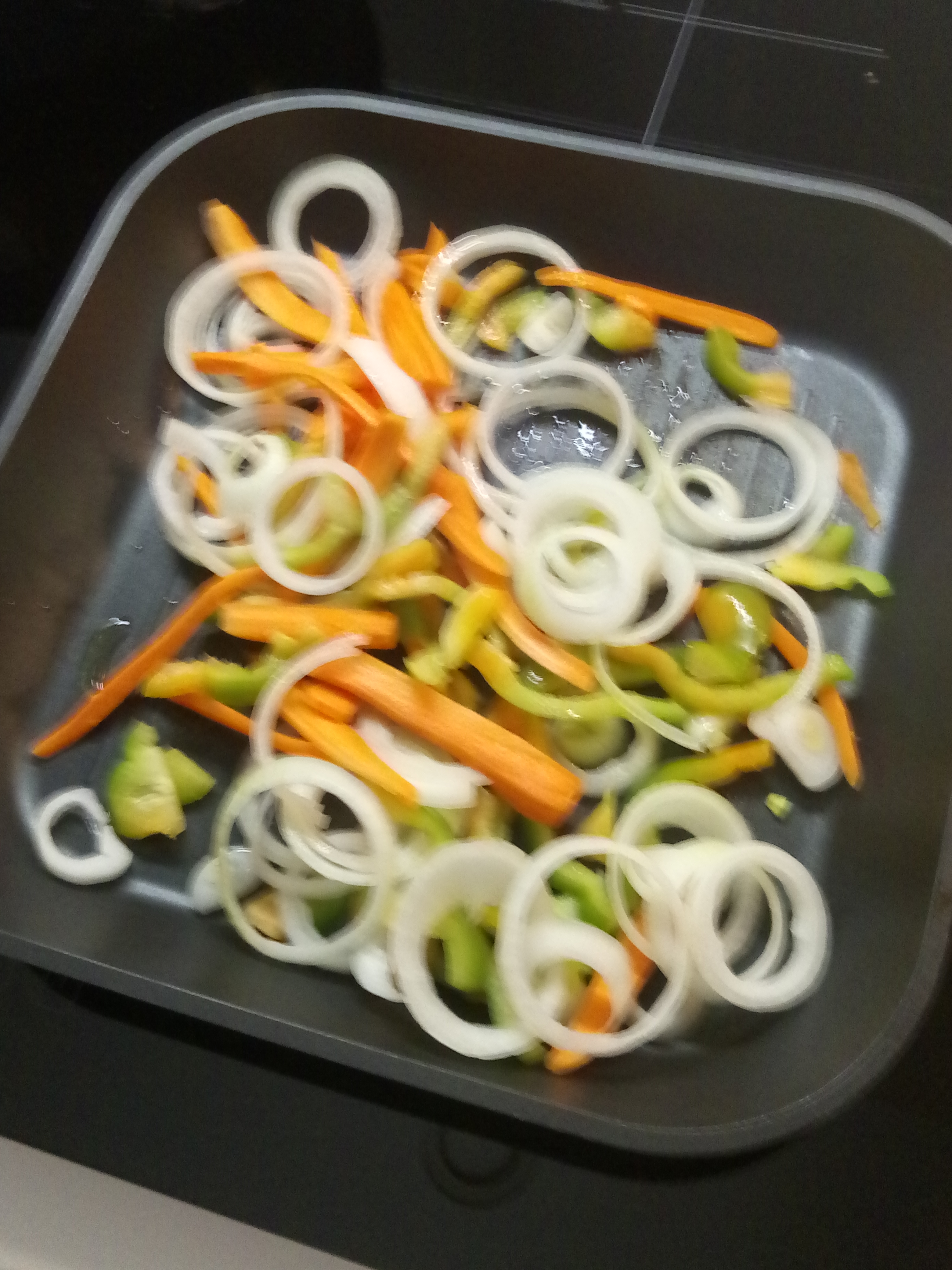 Doe een beetje olijfolie in een grill. Snijd de ui in ringen, de knoflook in plakjes, de geschraapte wortel in reepjes en de paprika ook in reepjes. Grill de groenten, behalve de knoflook, in de grillpan op middelhoog vuur totdat de groenten bruin verkleurd. Doe ondertussen het gehakt met wat olijfolie, de knoflook, de rozemarijn, de knoflook, de tijm, peper en zout in een kom en kneed de gehakt met de ingrediënten tot een grote bal. Sla hem plat als een grote hamburger van ongeveer 1 cm dik. Zet het water op voor de fusilli.