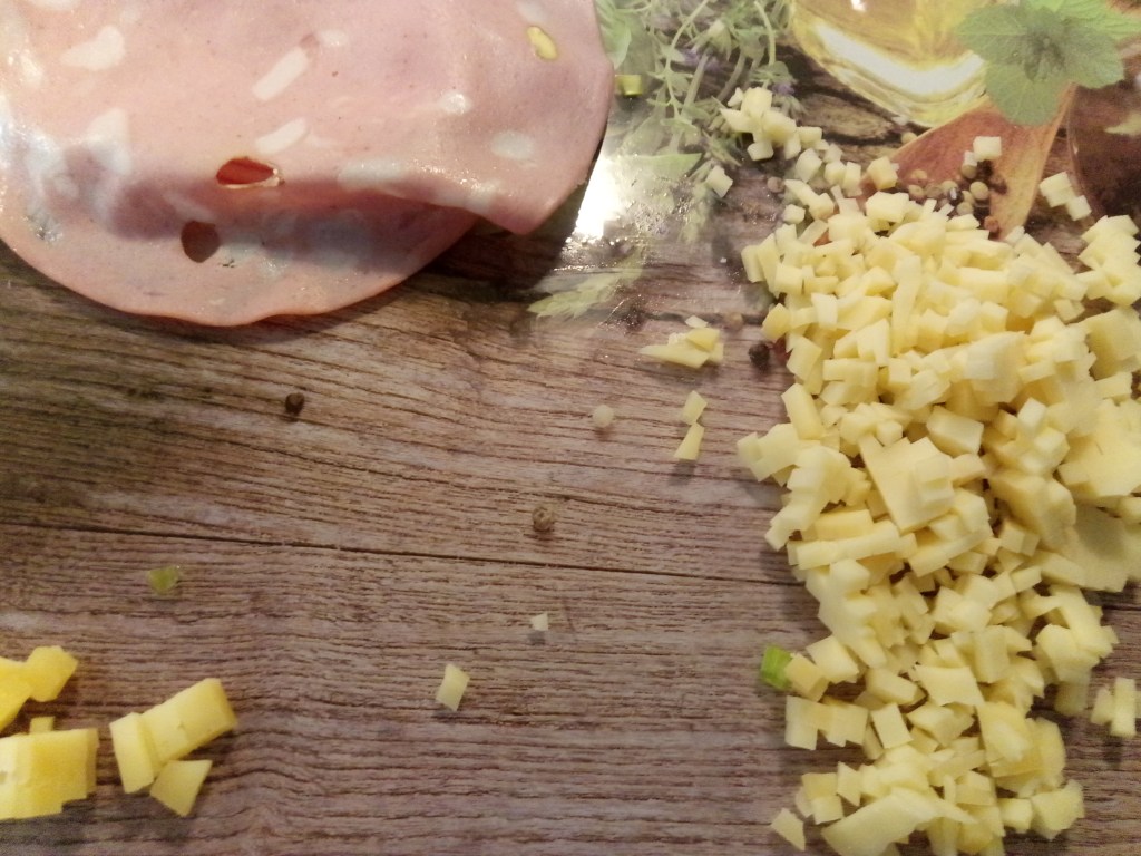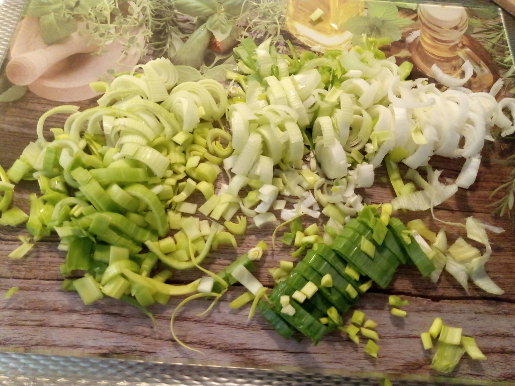 1 prei, 1/2 glas rode wijn, 50 gr Mortadella met pistachenoten uit Bologna (de Lidl heeft goede, ander de Italiaanse speciaalzaak), 160 gr Fusilli, 60 gr Provola dolce, Parmezaan, olijfolie, extra vergine olijfolie, zout, zwarte peper