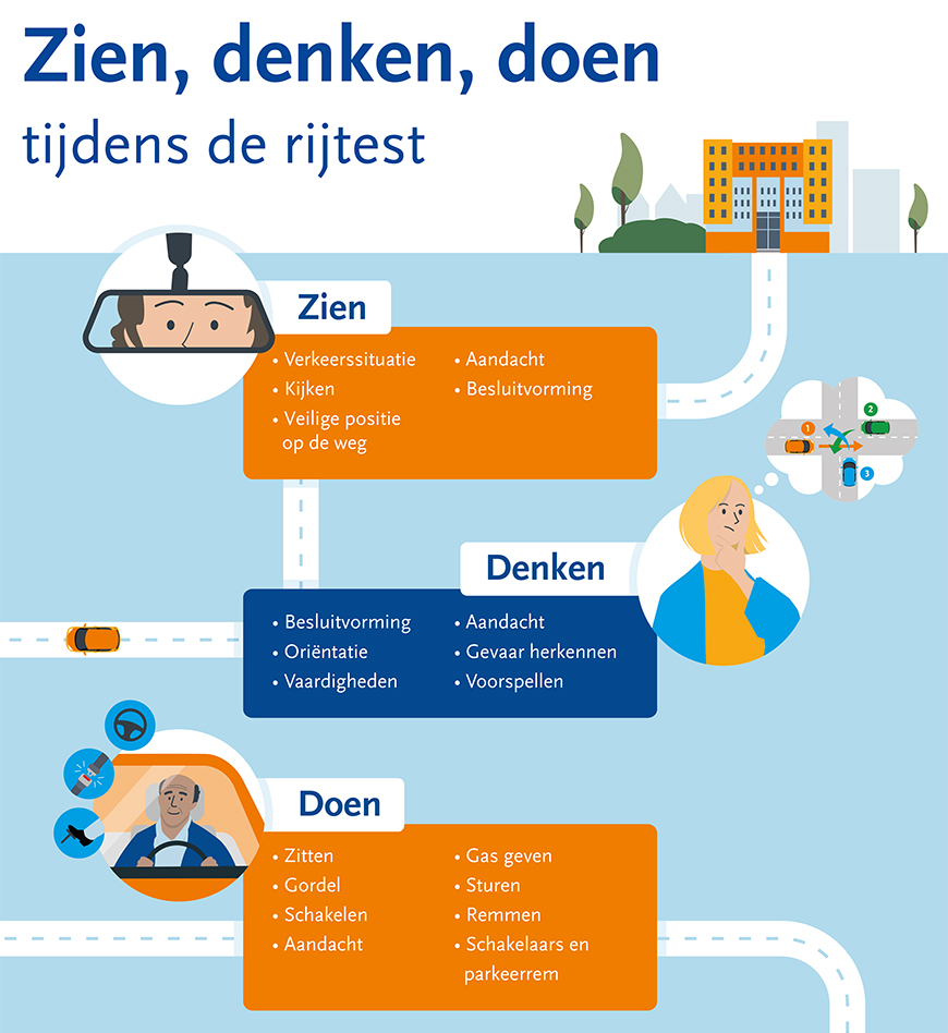 Een rijtest is altijd maatwerk, aangepast aan uw situatie. Afhankelijk daarvan ligt de nadruk in de rijtest op ‘zien’, ‘denken’ of ‘doen’. En soms op een combinatie hiervan.