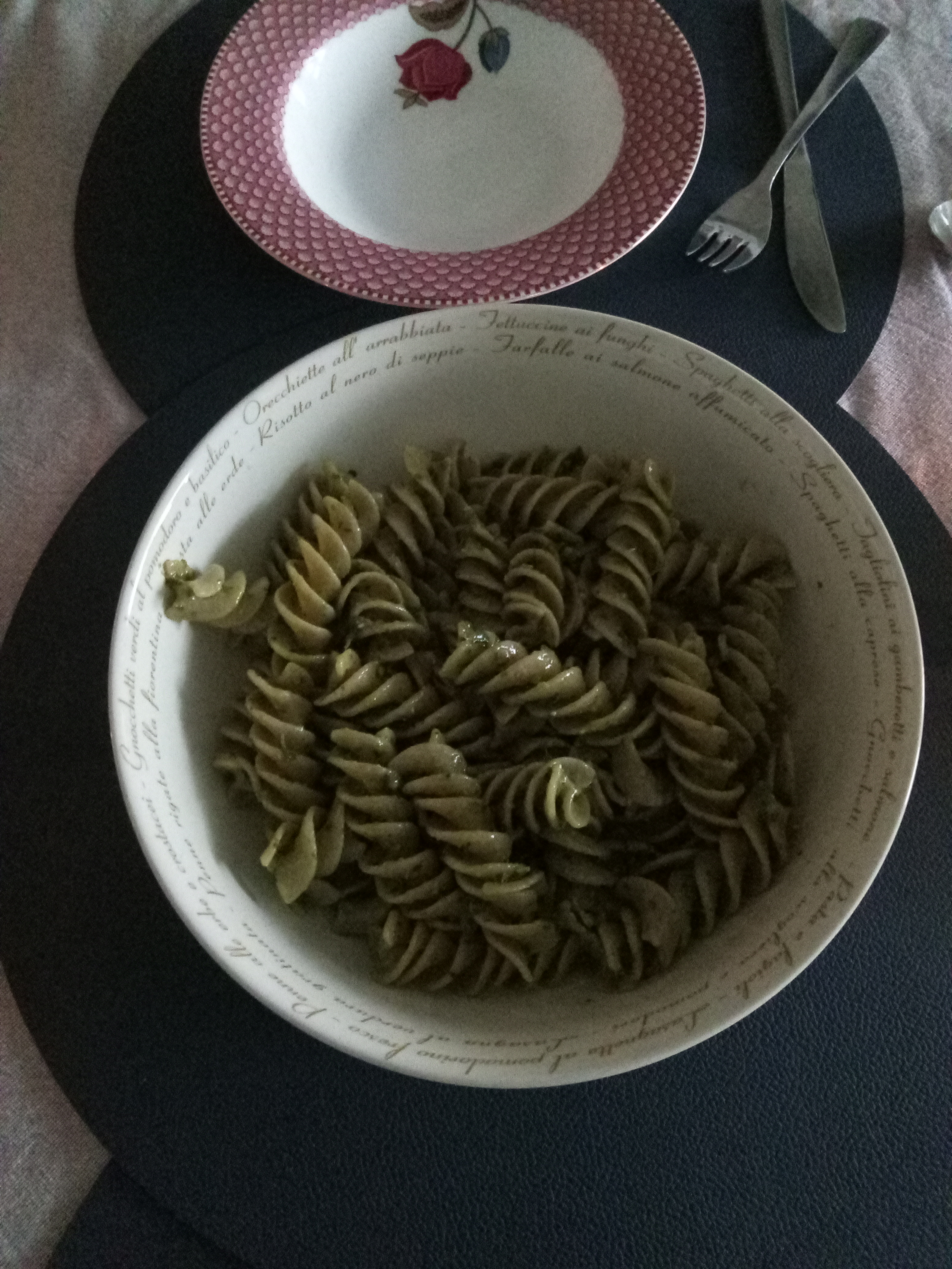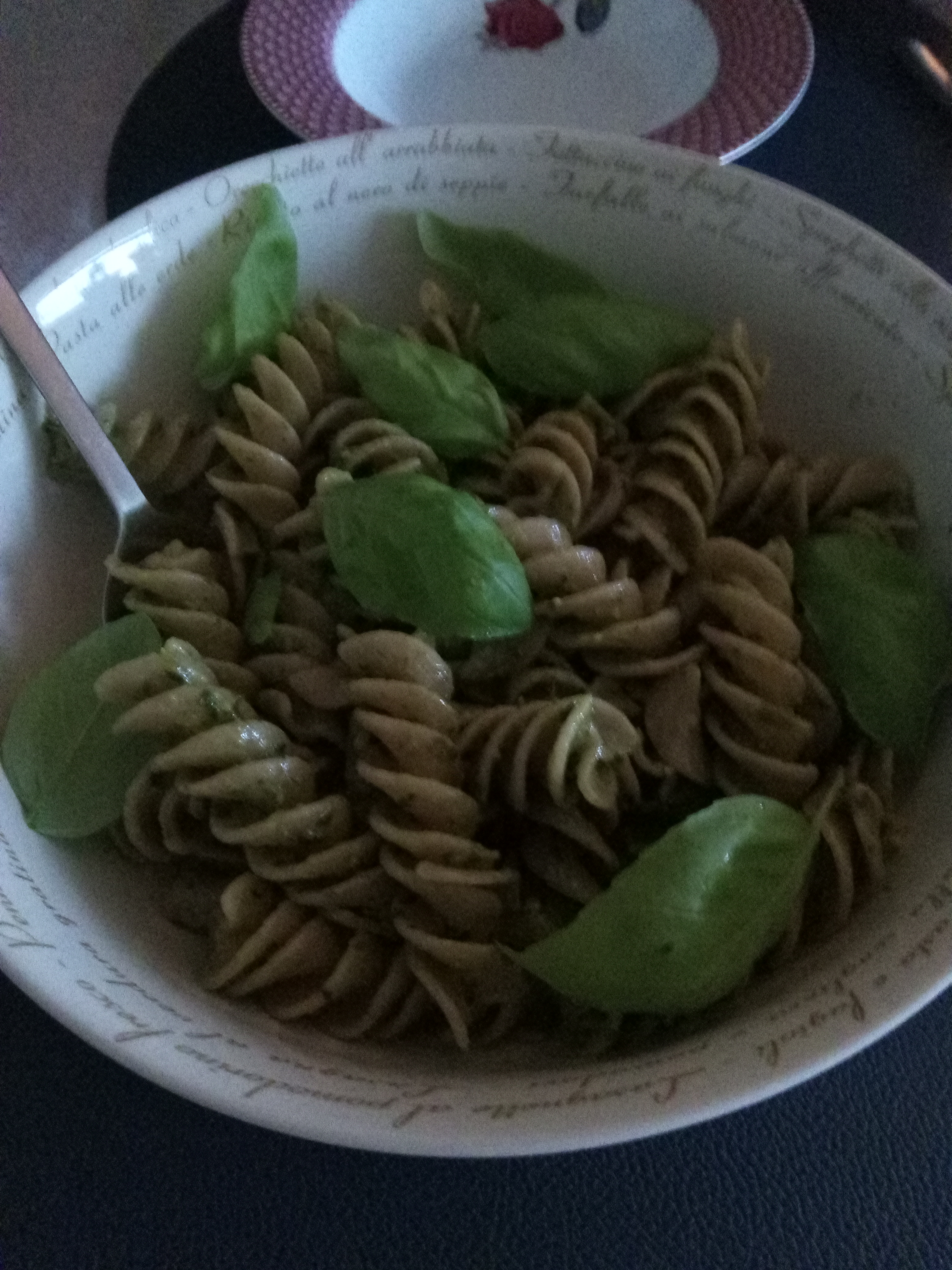 200 Gr biologische volkoren Il Fusillone fusilli, pesto alla Genovese (deze moet je of op voorraad hebben of maken), peper, zout, extra vergine olijfolie, basilicum