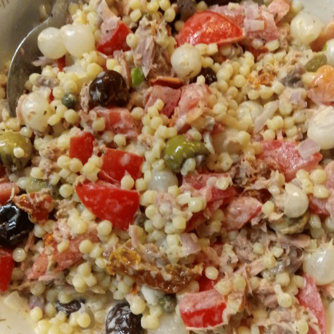 150 gr pasta piombi (Italiaanse couscous), 125 gr zilveruitjes, el kappertjes, handvol zwarte olijven met pit, handvol groene olijven, 1 kleine sjalot, 4 ansjovis filets, 6 gedroogde tomaten, 2 tomaten, 3 gekookte eieren, 2 el mayonaise, 1 grote theelepel mosterd, een scheut witte balsamico azijn, 1 blikje tonijn op olijfolie, extra vergine olijfolie, Italiaanse kruiden, verse bladpeterselie, chilipeper, zout
