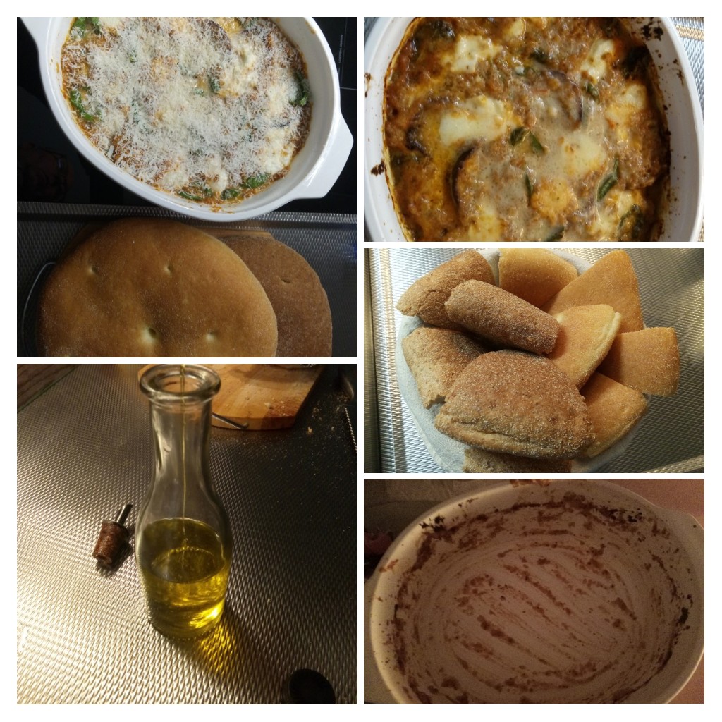 Was en snijd de aubergines in plakken van 3 á 4 mm dik. Leg ze in laagjes in een vergiet en strooi grof zout over elke laag. Dek af en laat een uurtje staan zodat ze hun bittere vruchtvocht verliezen. Maak ondertussen de tomatensaus klaar door de verse of gepelde tomaten (of handiger de ingevroren tomatensaus), de knoflook, 3 el extra vergine olijfolie, enkele blaadjes basilicum, een snufje zout, en twee theelepels suiker 15 min te koken in een pan. Wanneer de saus afgekoeld is pureer je het tot een homogene saus. Spoel het zout van de aubergines en dep ze droog met keukenpapier of leg ze tussen twee theedoeken te drogen. Grill ze daarna in de met 200 gr voor verwarmde oven of grill ze in de grillpan aan beide kanten mooi bruin. Haal ze uit de oven op pan en laat ze op keukenpapier uitlekken. Zet de oven weer aan om voor te verwarmen op 200 gr. Neem een groet ovenschaal waar alles makkelijk in past en vet deze in met de olie. Schep er r el tomatensaus in en leg er een eerste laag aubergines in zodat de hele bodem bedekt is. Snijd de mozzarella in plakken van 5 mm en leg op de aubergines in de schaal een laag, daarna weer een laag aubergines dan Parmezaan en basilicum blaadjes, weer een laag aubergine, dan weer een laag mozzarella. Dit herhaal je totdat de aubergines er allemaal in liggen. Als laatste laag doe je de mozzarella en daar overheen de Parmezaan strooien. Dan als laatste besprenkelen met extra vergine olijfolie. Zet de schaal voor een halfuur tot driekwartier in de oven en laat mooi bruin bakken totdat er een mooie bruine korst erop ligt. Dien direct op met zelfgebakken broden of stokbrood. Mag natuurlijk ook bij de bakker gekocht zijn.
