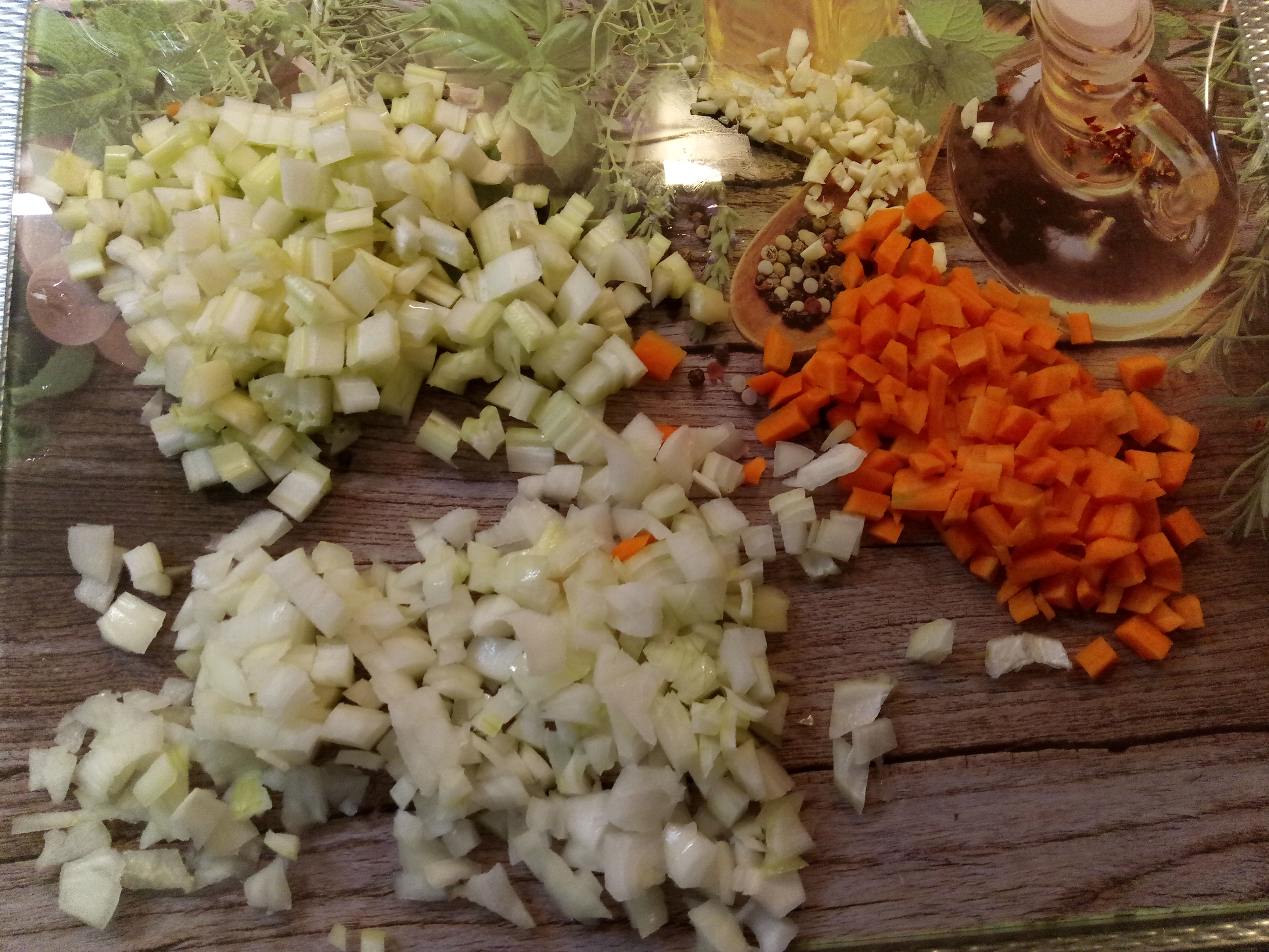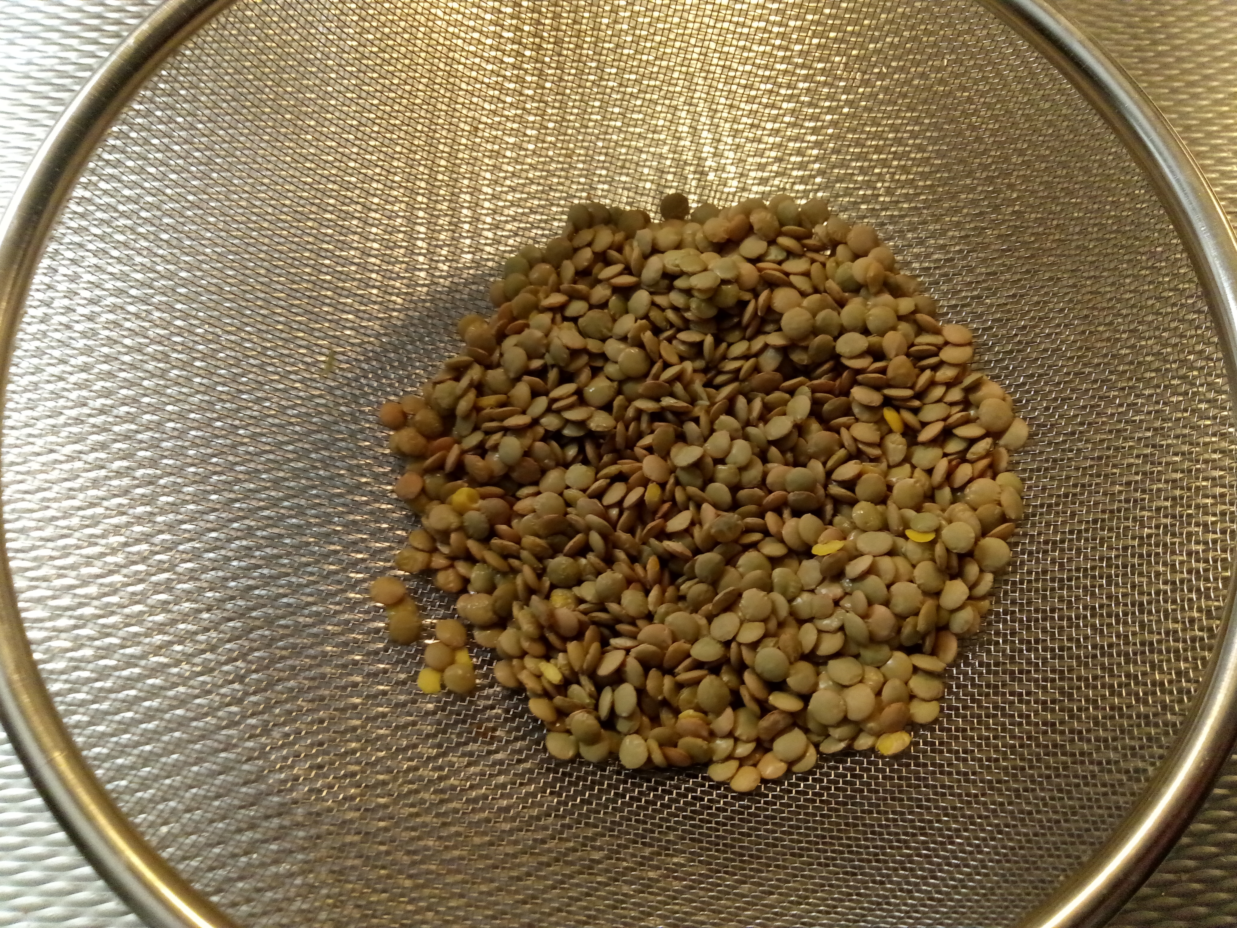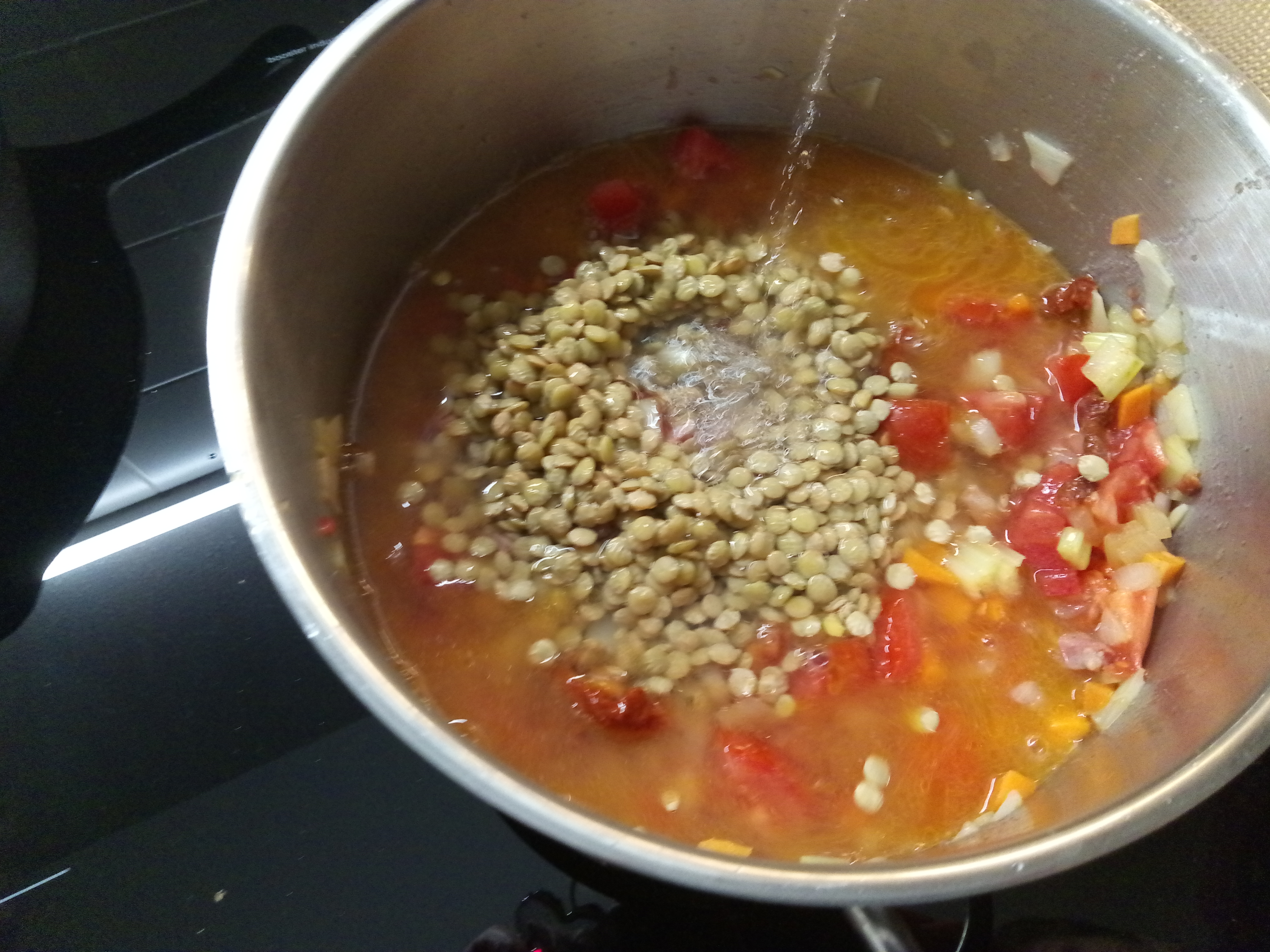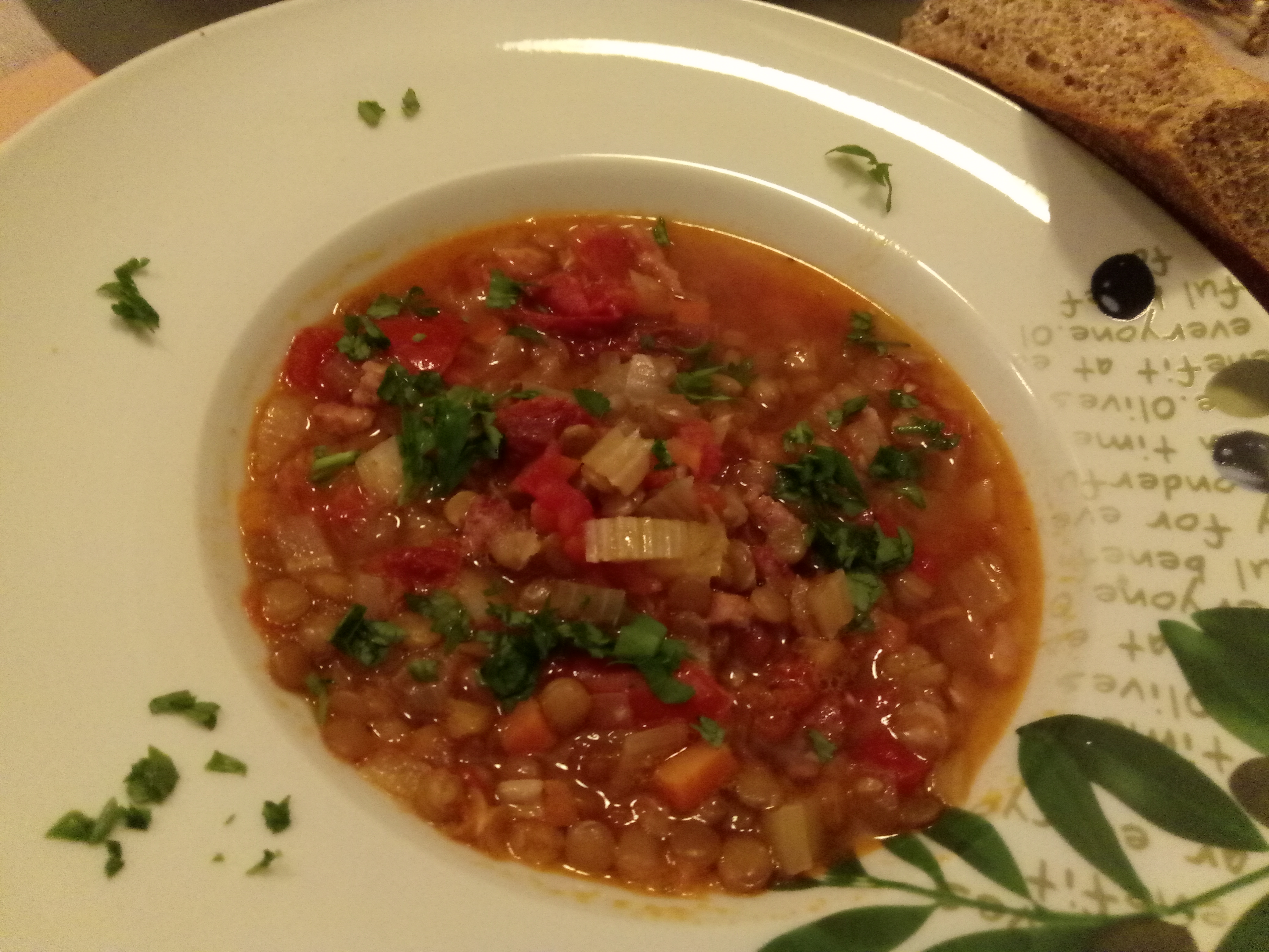400 gram bruine linzen, 100 gram spekreepjes, 4 tomaten, 4 wortels, 4 stengels bleekselderij, 2 uien, 4 knoflook, 1 rode peper, 6 zongedroogde tomaten op olie, 2 eetlepels extra vergine olijfolie, bosje verse peterselie (koop deze eens in een Marokkaanse supermarkt of de markt. Is vele malen goedkoper!), zeezout, zwarte peper