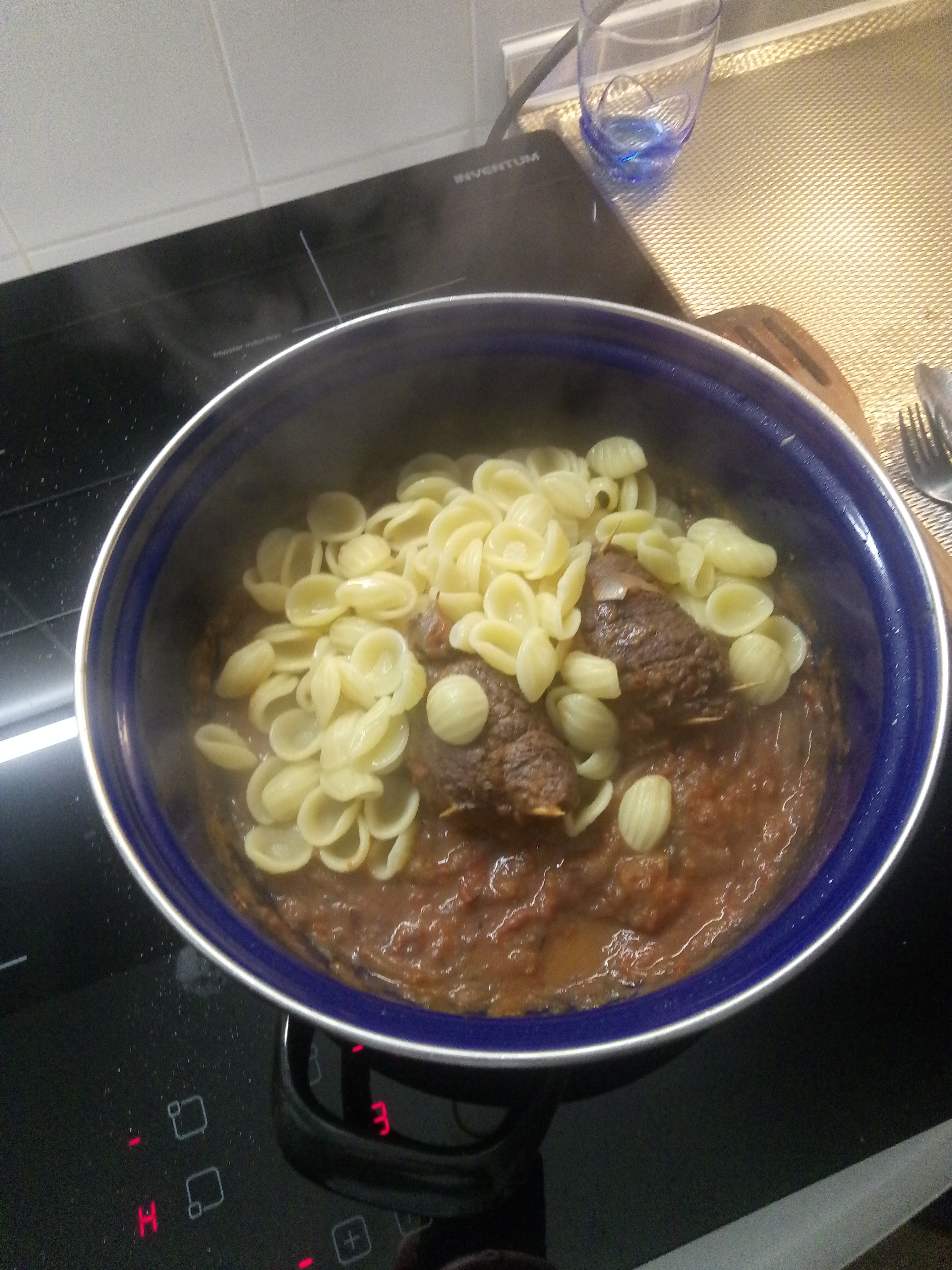 Voor ieder persoon 1 of 2 plakken paardenvlees, voor elke plak paardenvlees ook een dunne plak pancetta of ander soort spek, 50 gr paneermeel (kan je ook van beschuit maken), 1 takje peterselie of gedroogd uit de pot, 150 gr pecorino, 4 kleine knoflook, 1 grote ui, 4 el olijfolie, 1 glas rode wijn, 500 gr gezeefde tomaten (mag uit de diepvries), 300 gr orecchiette van Divella (mag ook een ander merk zijn), extra vergine olijfolie, zout, peper
