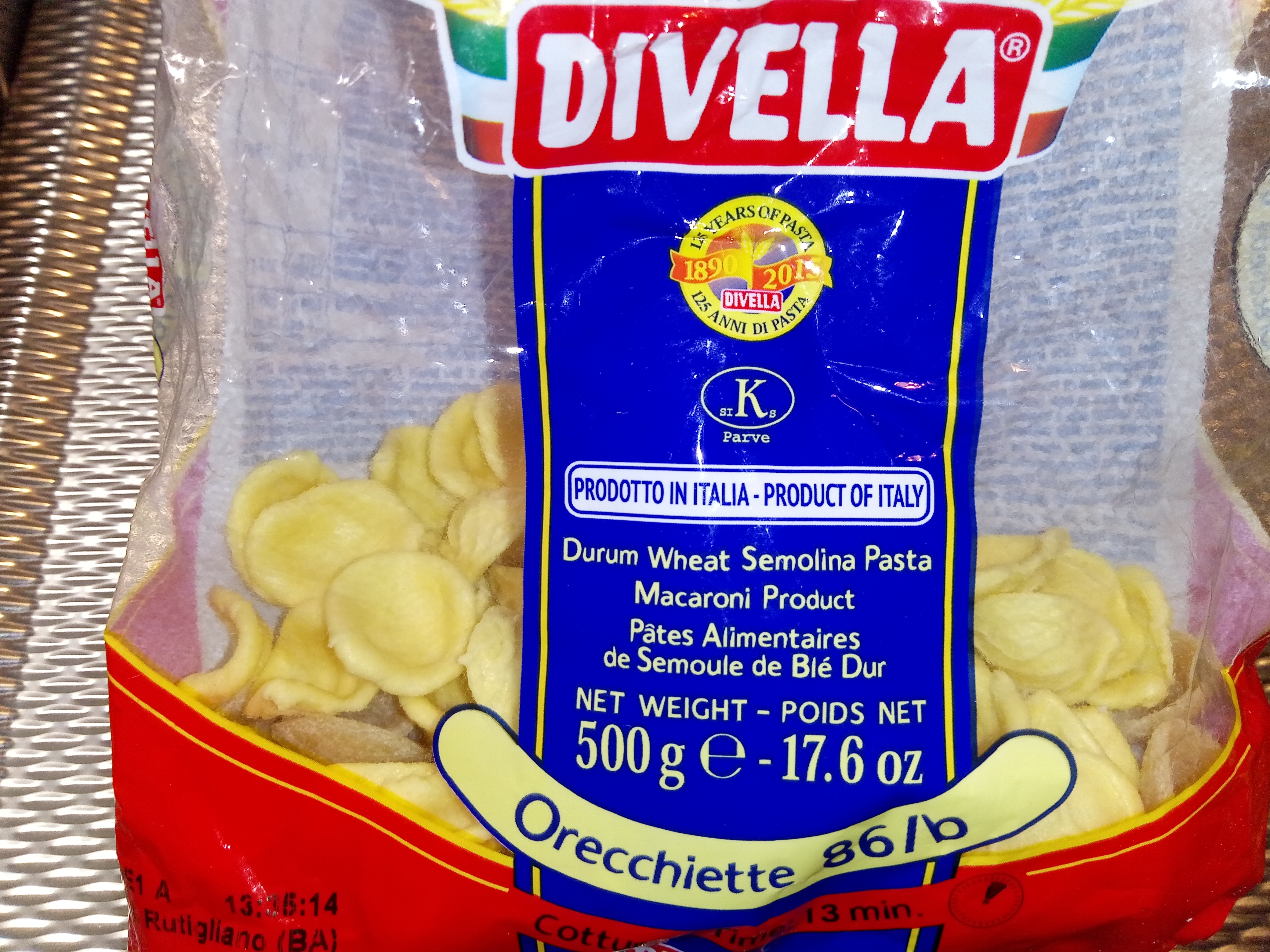 130 gr Orecchiette, 1 venkelknol, 1 ui, 1 blikje sardines, 40 gr rozijnen, peperoncino, 40 gr pijnboompitten, verse dille, zout, zwarte peper, extra vergine olijfolie