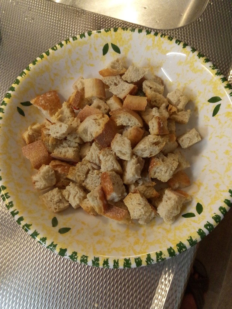 Je hebt echt oud brood nodig, dus laat brood minstens een dag ervoor in de open lucht staan. Je kunt boerenbrood, ciabatta of stokbrood gebruiken. Liefst geen wit. Scheur het brood in stukken (niet snijden, de structuur zal de dressing beter opzuigen). Gooi de stukken brood op een bakplaat (leg er ook wat gesneden plakjes brood bij), besprenkel ze met wat extra vergine olijfolie en zet in de oven die nog warm is van de paprika’s, maar niet meer aan zetten.