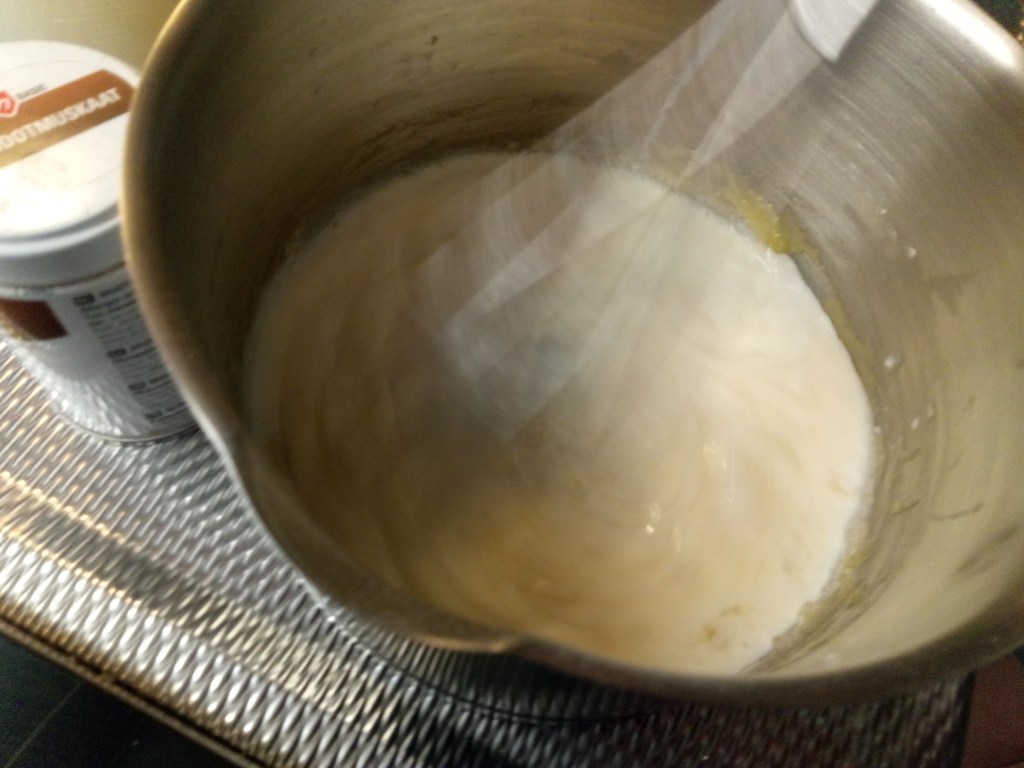 Maak nu de witte saus weer warm en breng op smaak met wat nootmuskaat.