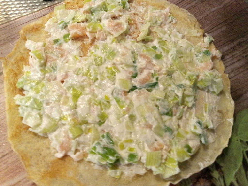 15 gr roomboter, 1/2 el suiker of bruine suiker, 1/2 prei, 60 gr gerookte zalm, zout, zwarte peper, Fritelle / Pannenkoeken (zie pagina ‘Zelf maken van Brodo tot Antipasti’), Besciamella / Bechamelsaus (zie pagina ‘Salsa’), nootmuskaat