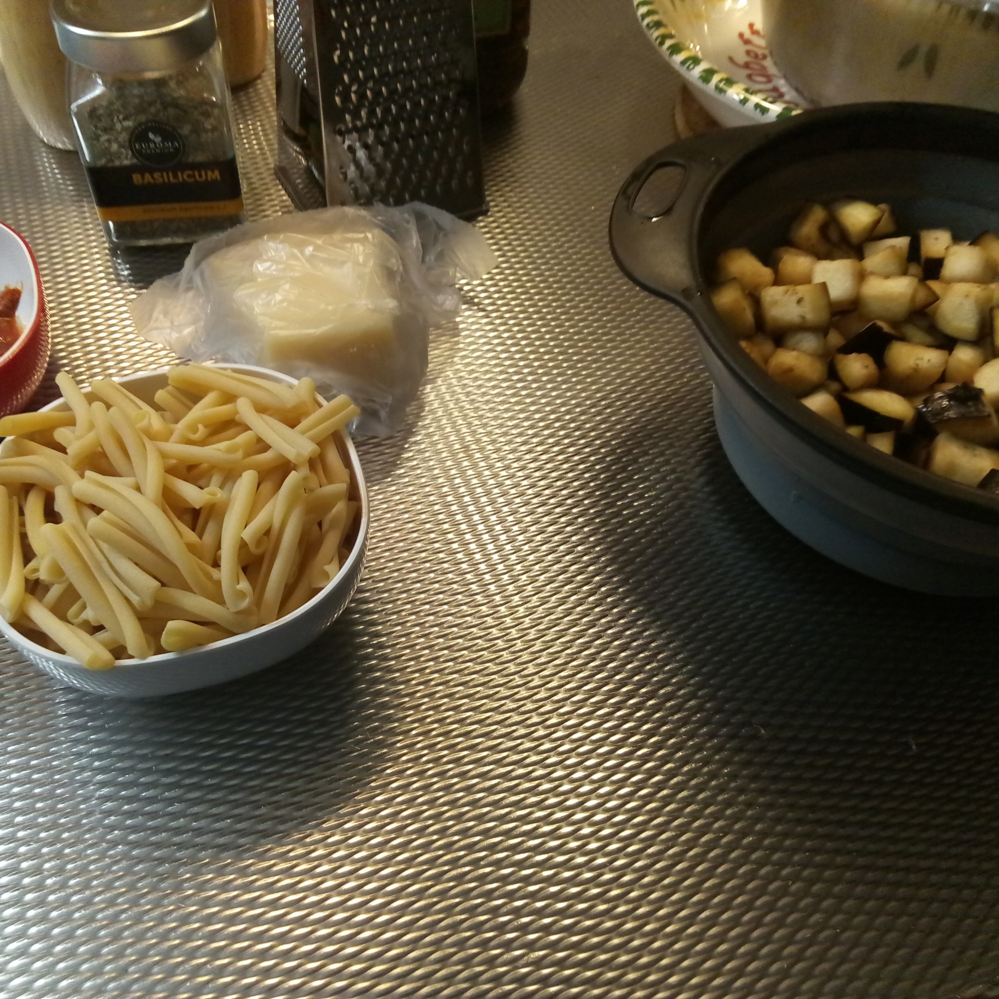 1 middelgrote (paarse) aubergine, 250 gr tomaten (mag ook uit blik), 2 knoflook, 150 gr Gaserecce No25 (of andere spaghettini, spaghetti), olijfolie, handvol verse basilicumblaadjes of gedroogde basilicum, ricotta of oude pecorino of Parmezaan, extra vergine olijfolie (neem de zelf aangemaakte basilicumolijfolie), zout, zwarte peper