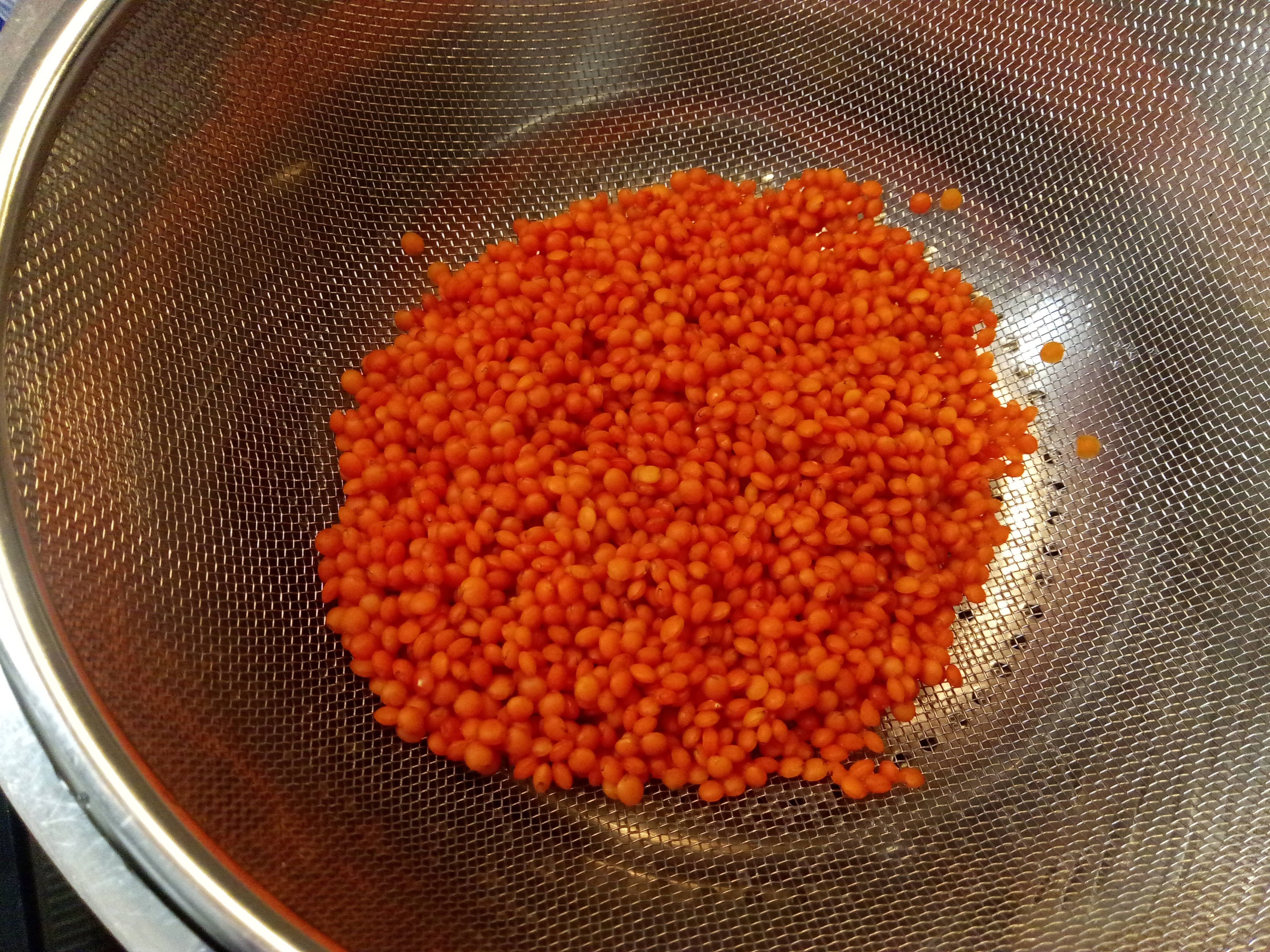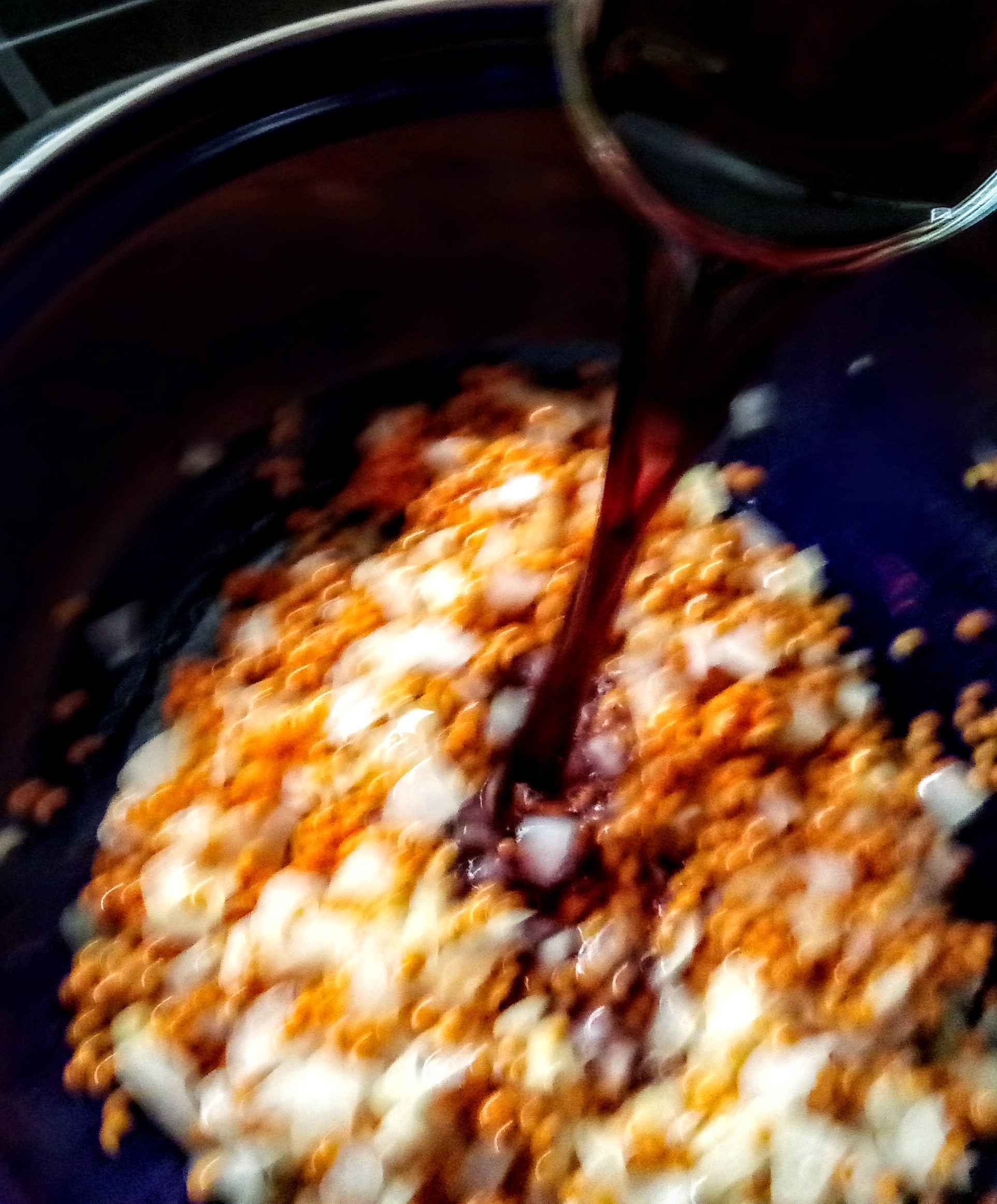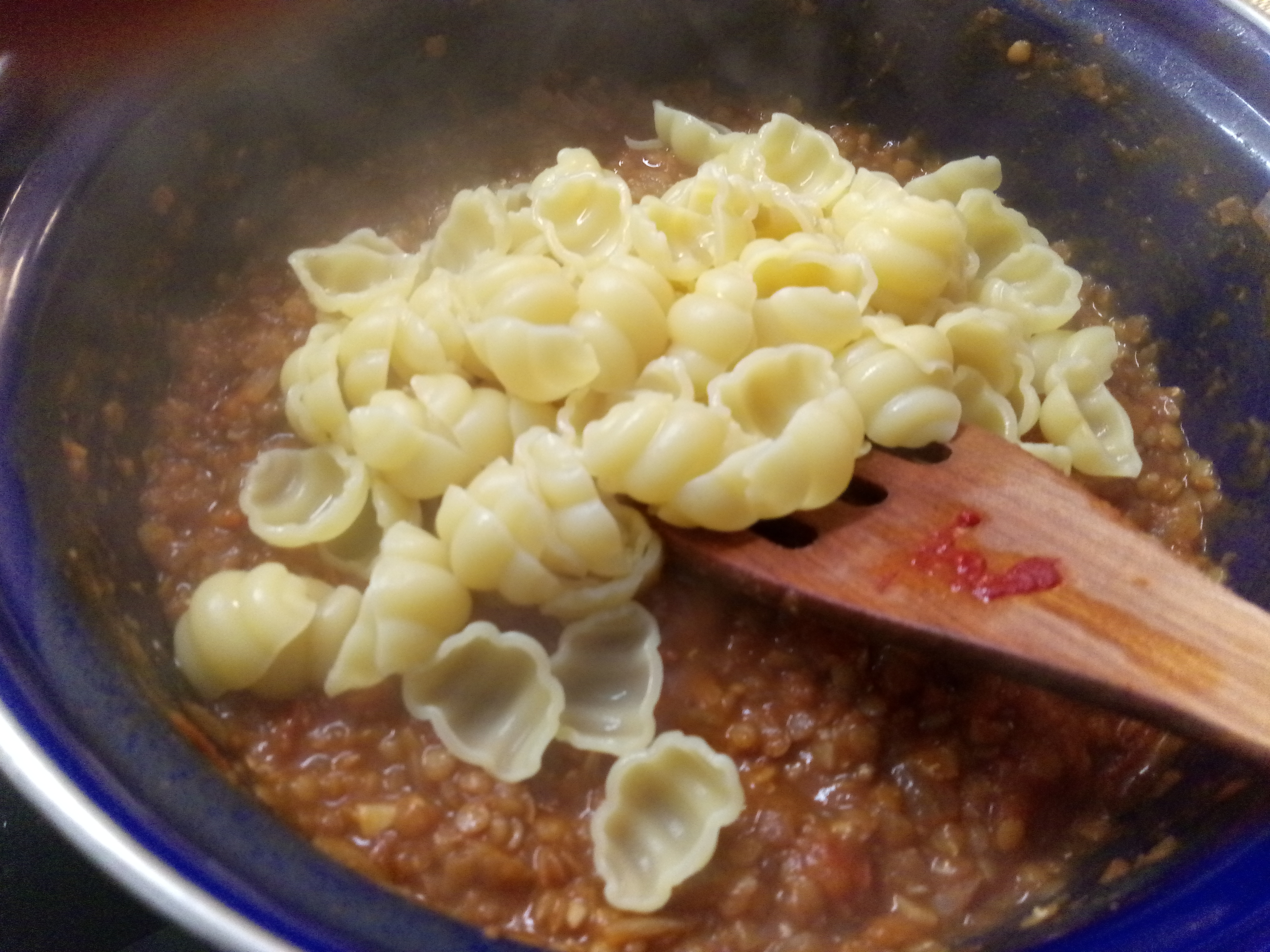 200 gr pasta, 200 gr rode linzen, 1 ui, 1 knoflook, 1 chili peper, 200 ml rode Chianti, 4 tomaten of 1 blik gepelde tomaten, 5 el tomatenpuree, 500 ml runderbouillon, zout, zwarte peper, verse peterselie, Parmigiano Reggiano, Extra vergine olijfolie