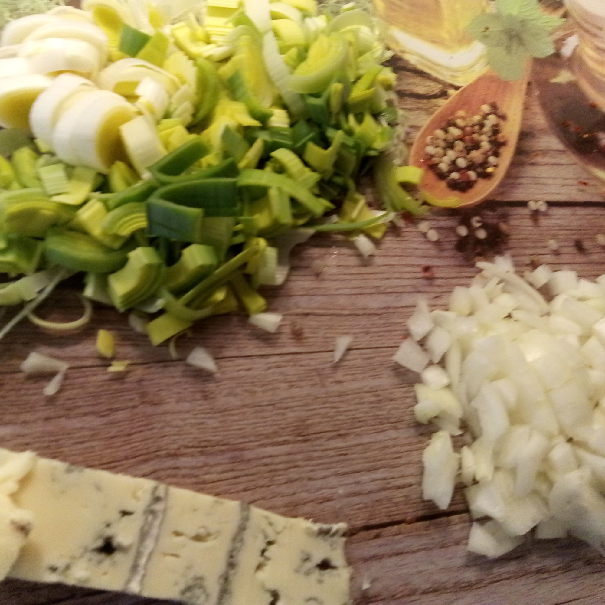 Zet een braadpan op middelhoog vuur met de extra vergine olijfolie (niet te hoog anders verbrand de olie). Snipper de ui en bak hem rustig aan totdat deze glazig. Snij intussen de prei in dunne ringen.