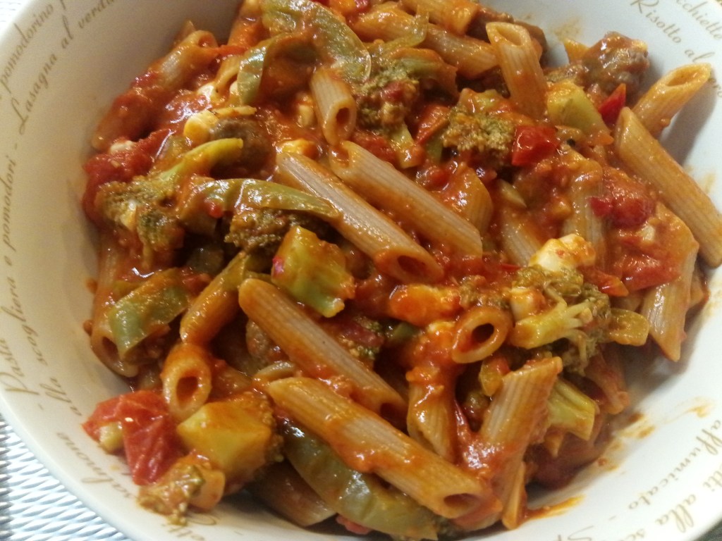 300 gr volkoren penne, 400 gr broccoli, 200 gr verse worst, 150 gr Pecorino, 1 groene paprika, 2 pikante rode pepers, 200 gr verse bombolini (kleine) tomaten (of 200 gr bombolini uit blik, je mag het sap eruit laten, mag er ook in blijven, wat jezelf lekkerder vind), 2 knoflook, 1 el venkelzaad, 1/2 glas witte wijn, 6 el extra vergine olijfolie, zout, zwarte peper