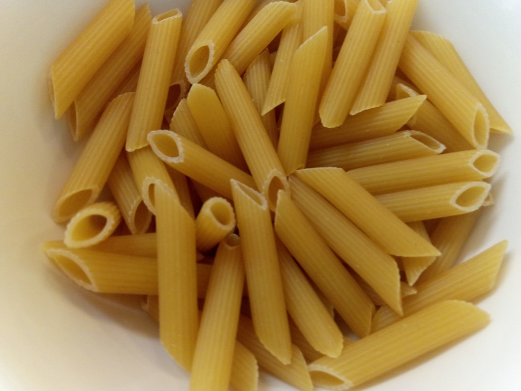 130 gr Penne, 2 Siciliaanse worst of andere worst, 2 aardappelen (In sommige landen zoals Italië wordt de aardappel als groente gezien. De aardappel bevat dan ook diverse vitamines en mineralen die in pasta en rijst niet voorkomen), 50 gr zongedroogde tomaatjes, verse tijm of gedroogde tijm uit pot, zout, zwarte peper, extra vergine olijfolie