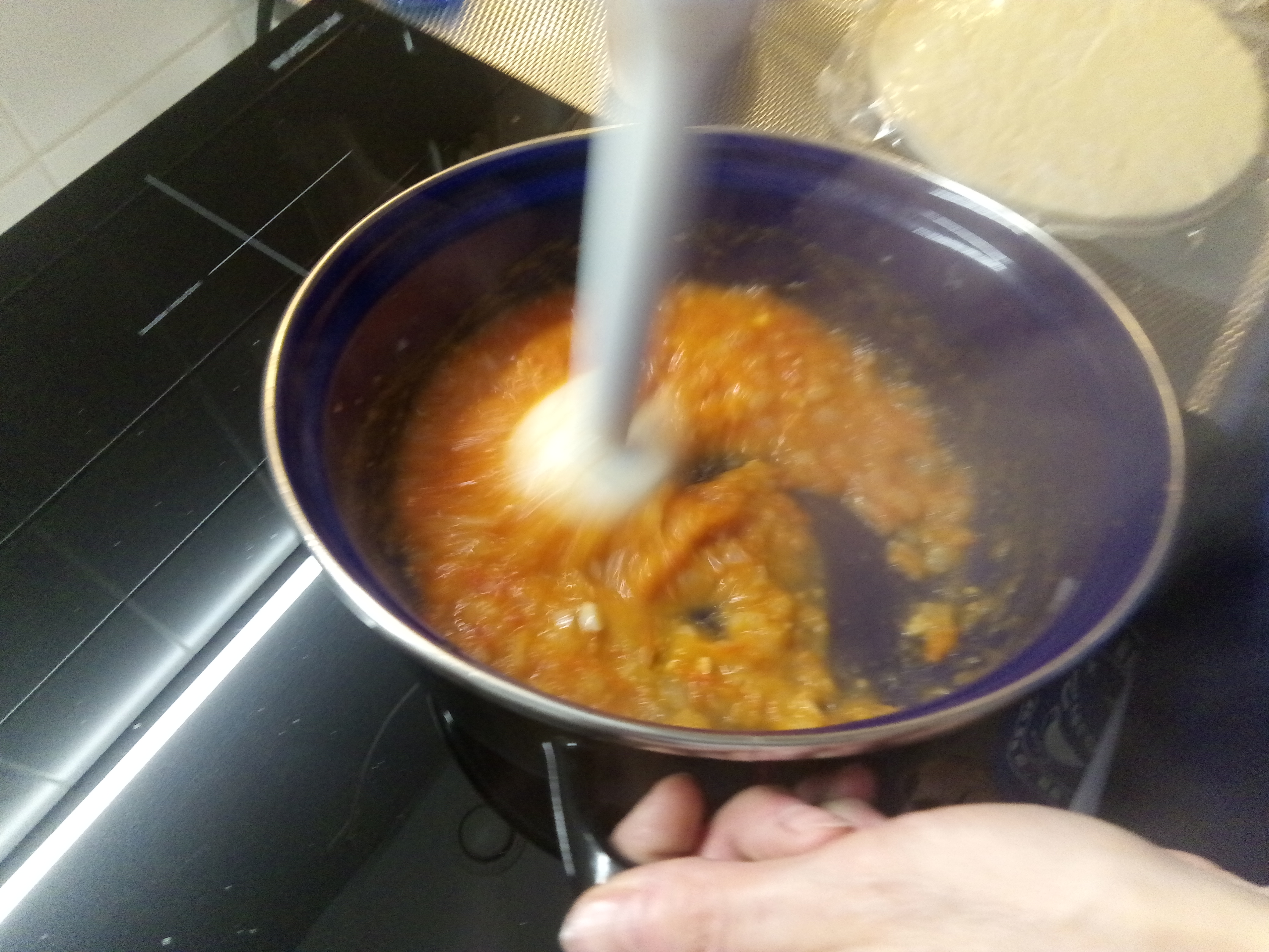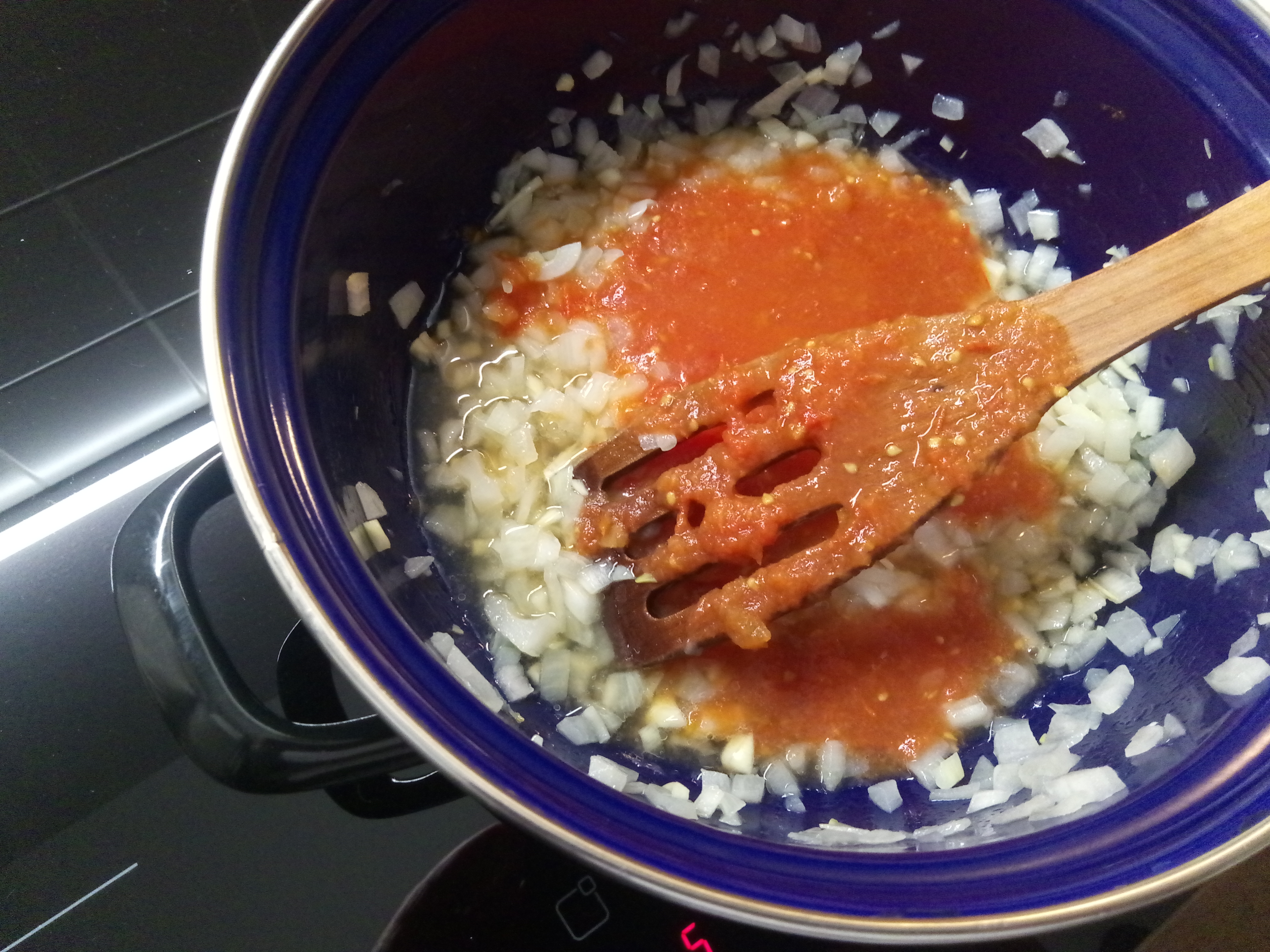2 bollen Pizzadeeg, 1 grote witte ui, 2 knoflook, 3 el olijfolie, 6 plakken salami, ruime hoeveelheid geraspte Parmezaan, 1 zakje ingevroren tomatensaus (mag ook nu maken), handvol oregano, zout, peper