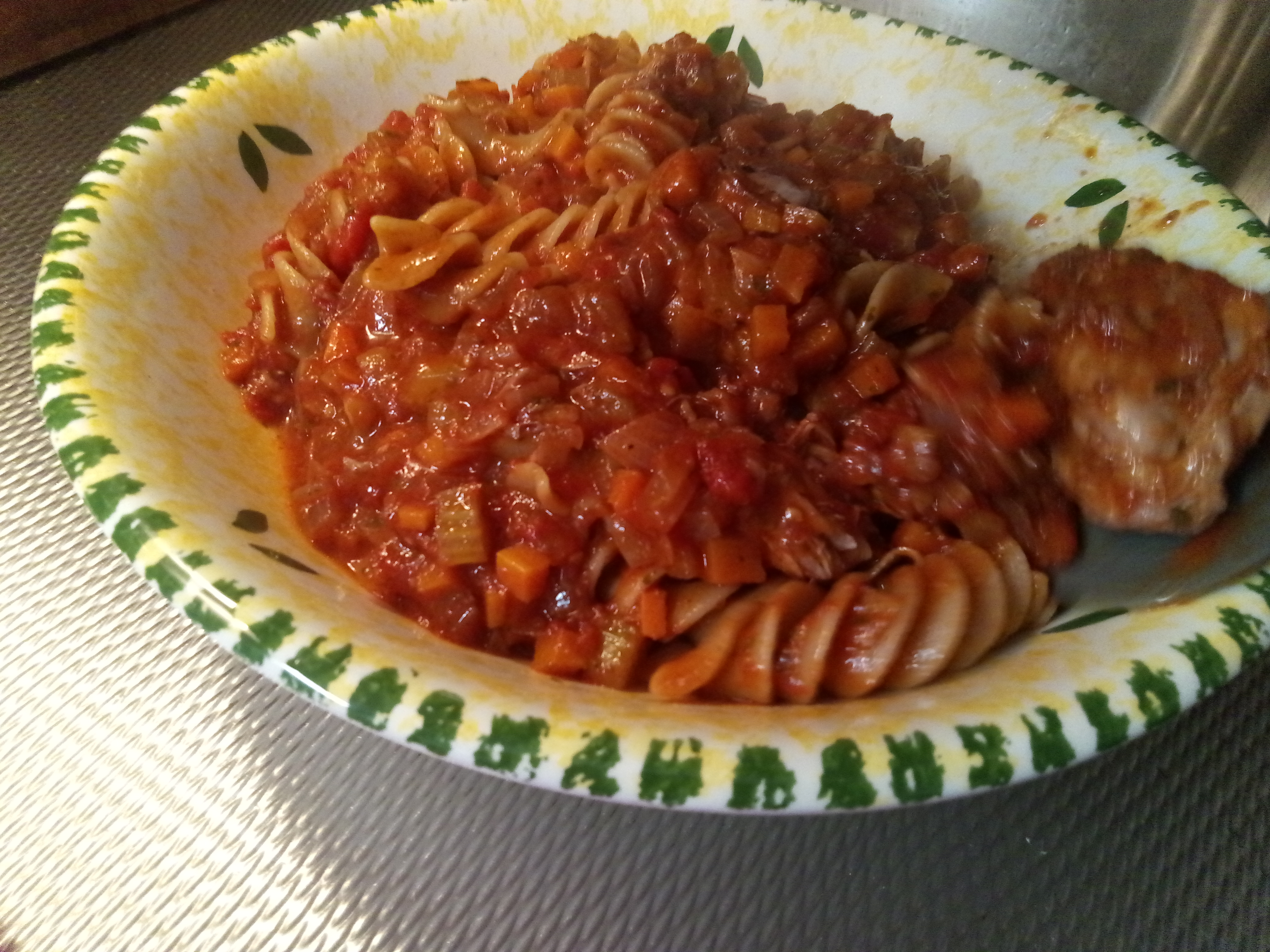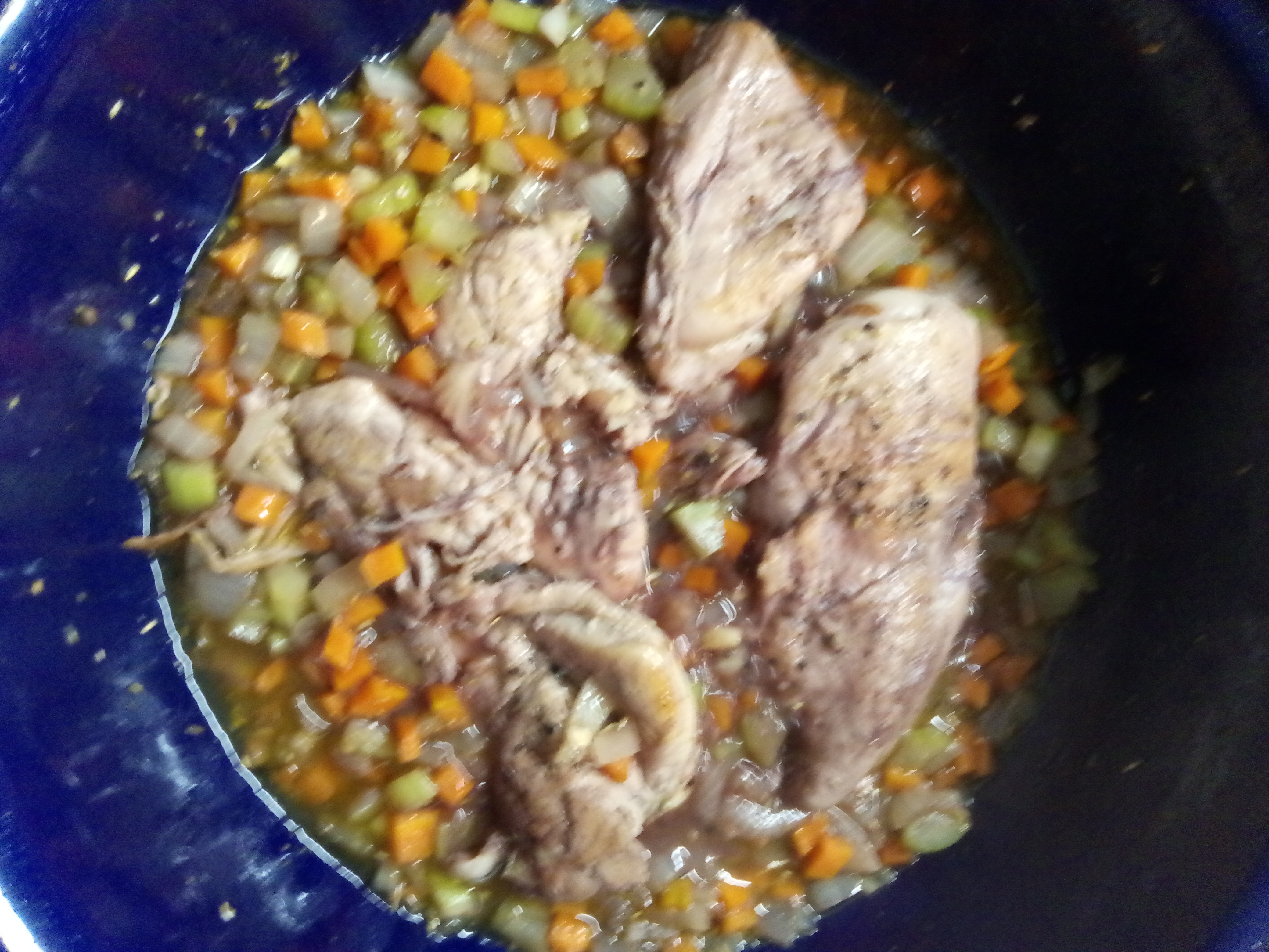 3-4 grote kippendijen of kippenpoten of kippenfilet (de laatste hadden wij), 300 gr grote il Fusillione, 1 ui, 2 wortelen, 2 stengels bleekselderij, 1 knoflook, 2 el olijfolie, extra vergine olijfolie, 2 takjes verse rozemarijn of handjevol gedroogde uit de pot, 1 glas rode wijn, 1 blik 400 gr pruimtomaten, 1 el tomatenpuree, peterselie, peper, zout