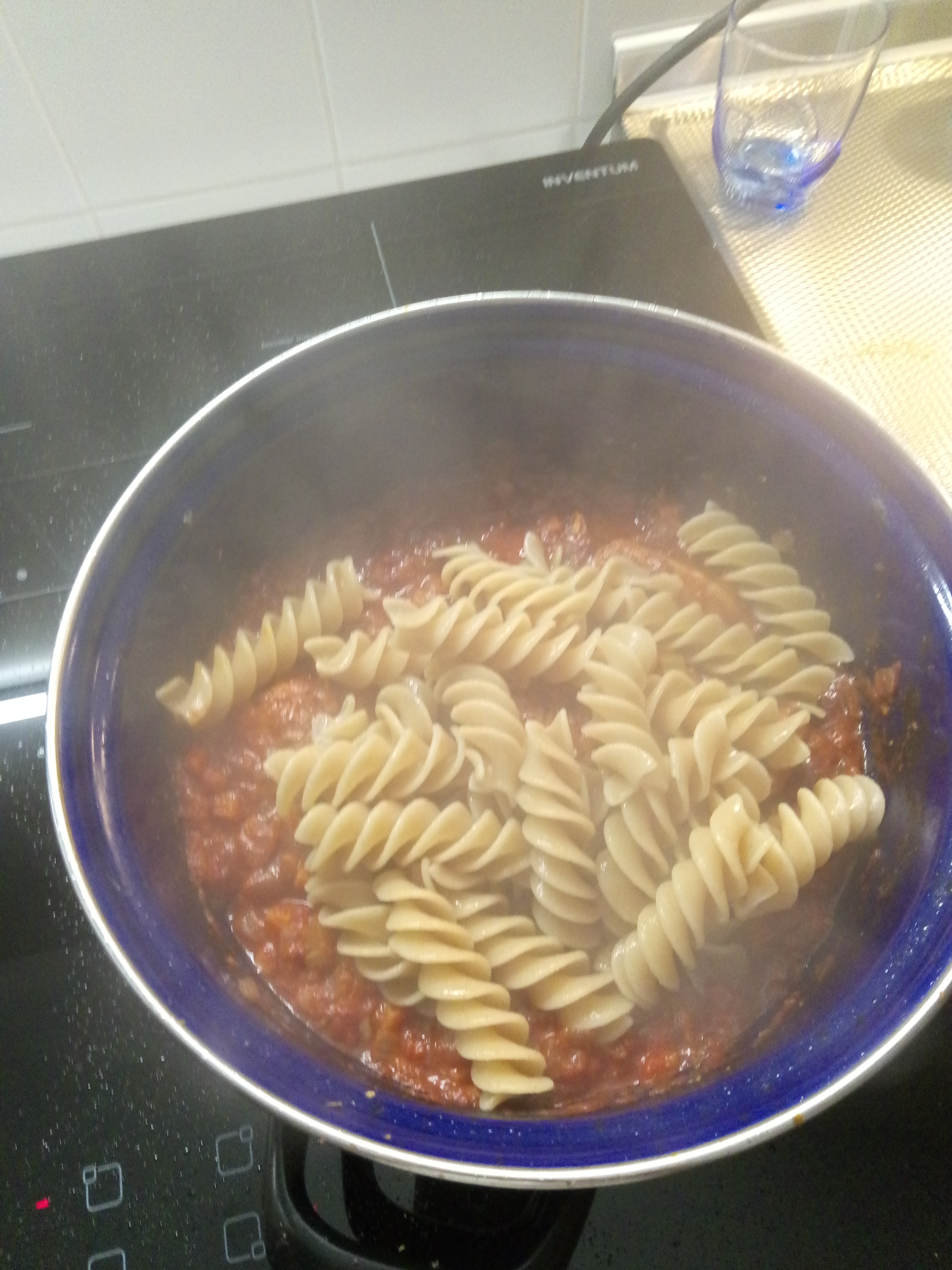 Kook ondertussen de il Fusillone (deze kan je soms kopen bij de Plus) al dente. Als de saus te dik word doe je er wat pasta water bij (de gluten maken er een mooie stroperige saus van). Giet de pasta af en voeg bij de saus en meng voorzichtig. Serveer en bestrooi met de peterselie.