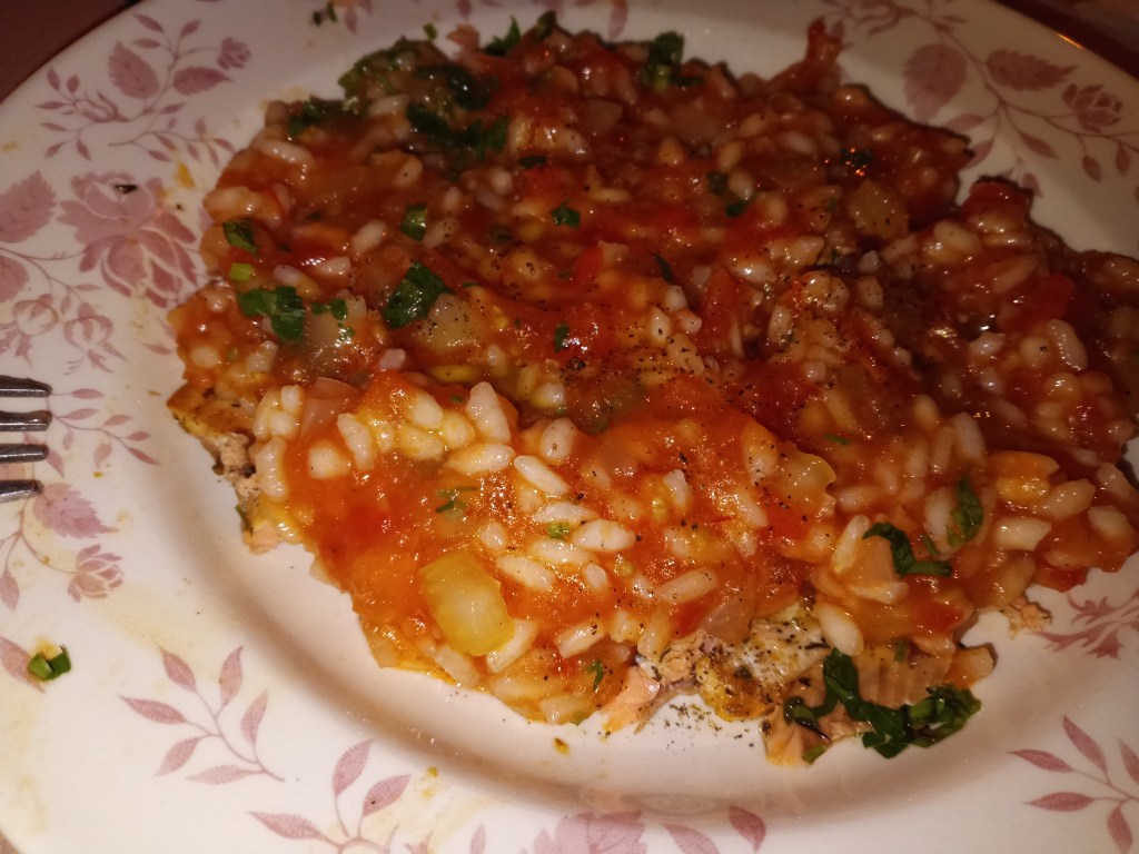350 gram risottorijst, 5 liter kippenbouillon, 1 stengel selderij kleingesneden, 1 glas droge witte wijn, 1 ui fijngesnipperd, rucola fijngehakt, 4 eetlepels olijfolie, 1 blikje pomodori pelati of 4 tomaten, 100 gram parmezaase kaas, zout, zwarte peper