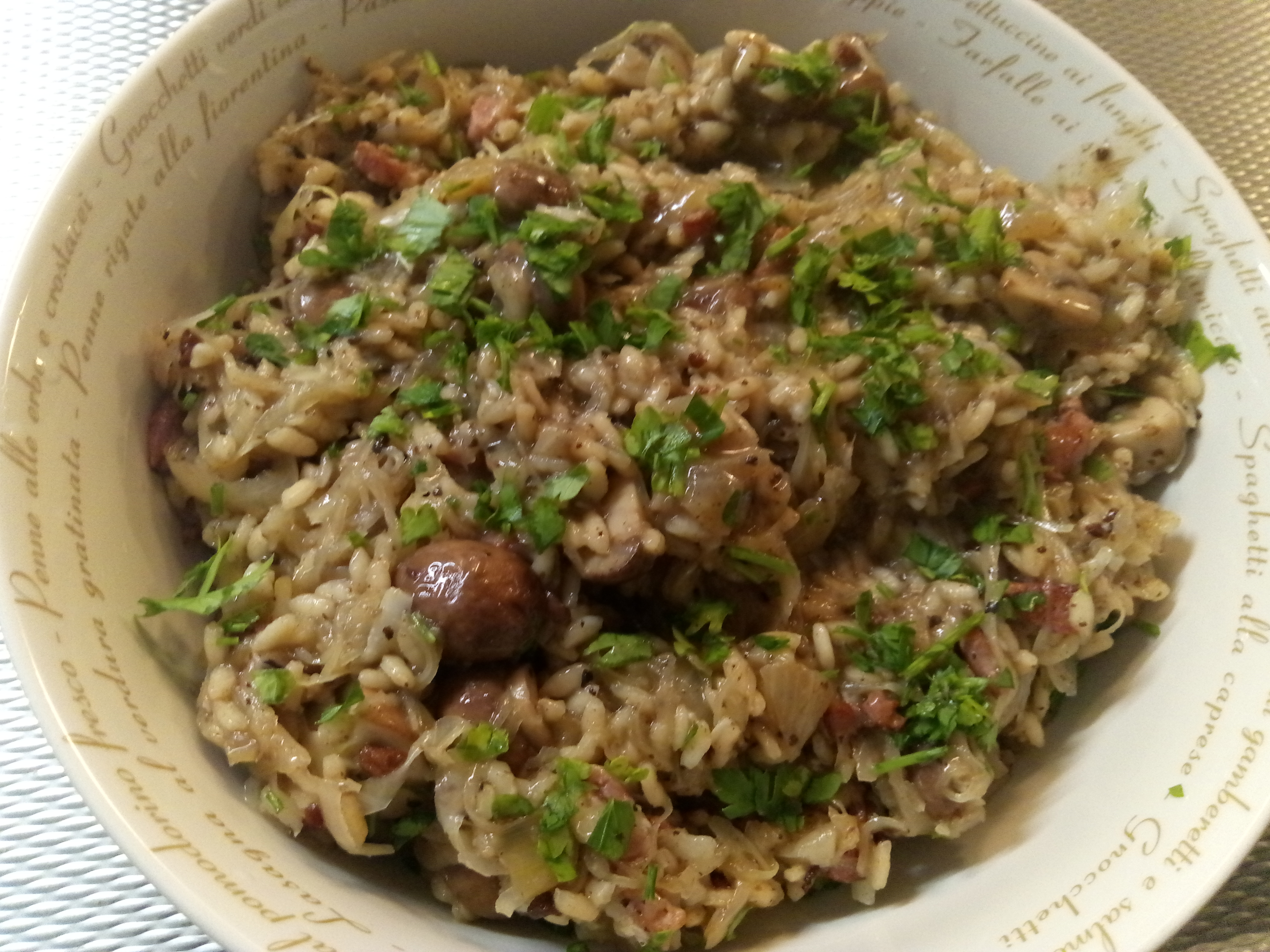 30 gr gedroogde porcini of een bakje kastanjechampignons of een bakje gemengde paddenstoelen, 1 ui, 100 gr spekblokjes, extra vergine truffelolie, 2 grote theelepels Tartufo tapenade, 150 gr Risotto, 1 glas witte wijn, weekwater (Brodo) van gemengde paddenstoelen of porcini, 1/2 blokje paddenstoelbouillon, 200 gr zuurkool, 1 el roomboter, 50 gr pecorino, 2-3 takjes verse bladpeterselie, zout, zwarte peper