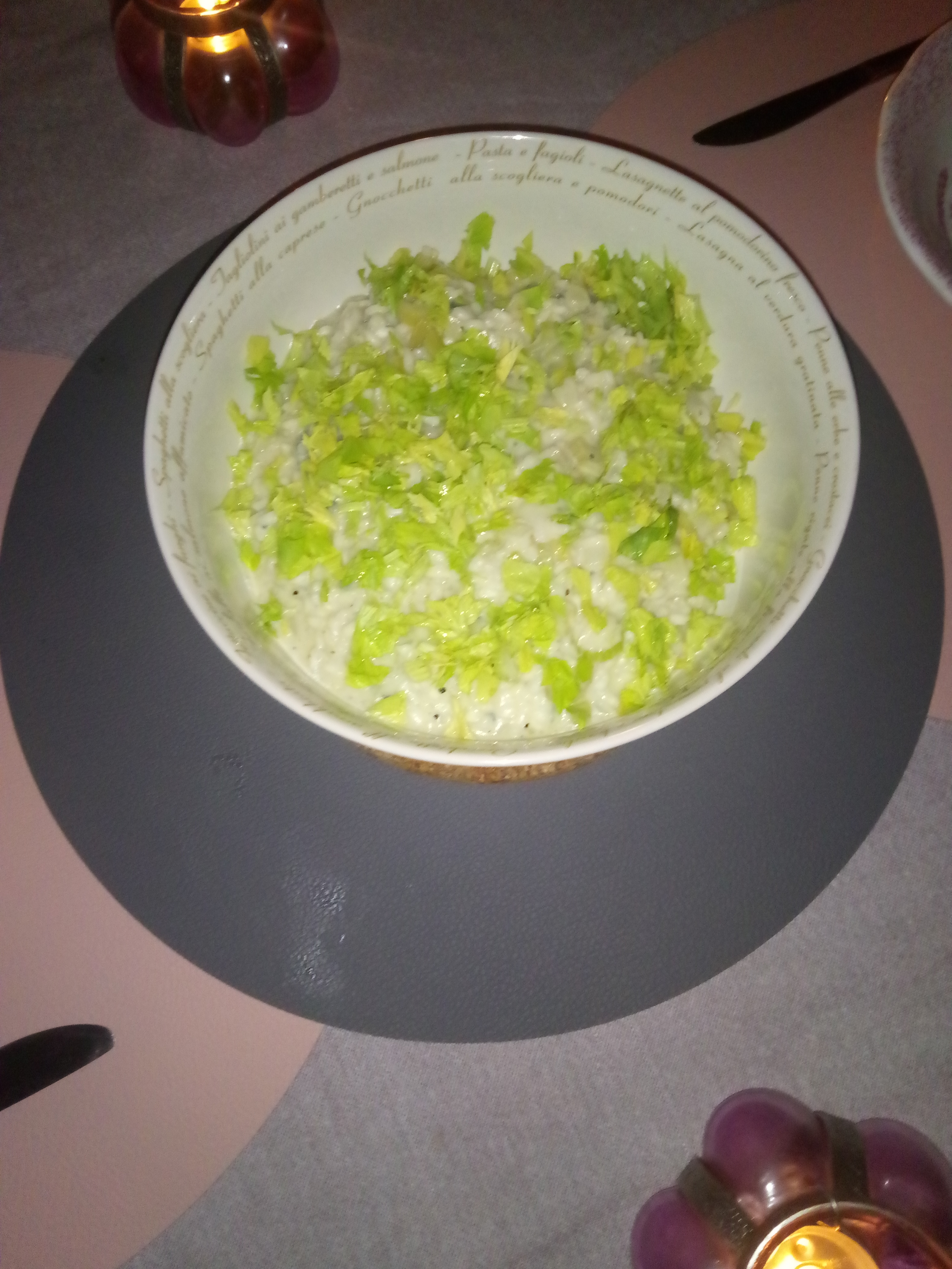 Doe nu de bleekselderij, zout, peper naar smaak erbij en roer voorzichtig met liefde door elkaar. Doe af en toe onder goed roeren een lepel brodo erbij. Rustig aan doen de rijst moet niet verzuipen. Beetje roeren, dan weer wat brodo, totdat de bleekselderij net nog knapperig is en er een heerlijke mooie risotto ontstaat. Doe nu de gorgonzola erbij zodat de risotto romig wordt. Garneer met de overgebleven blaadjes bleekselderij. Eventueel de Parmezaan over de risotto op het bord.