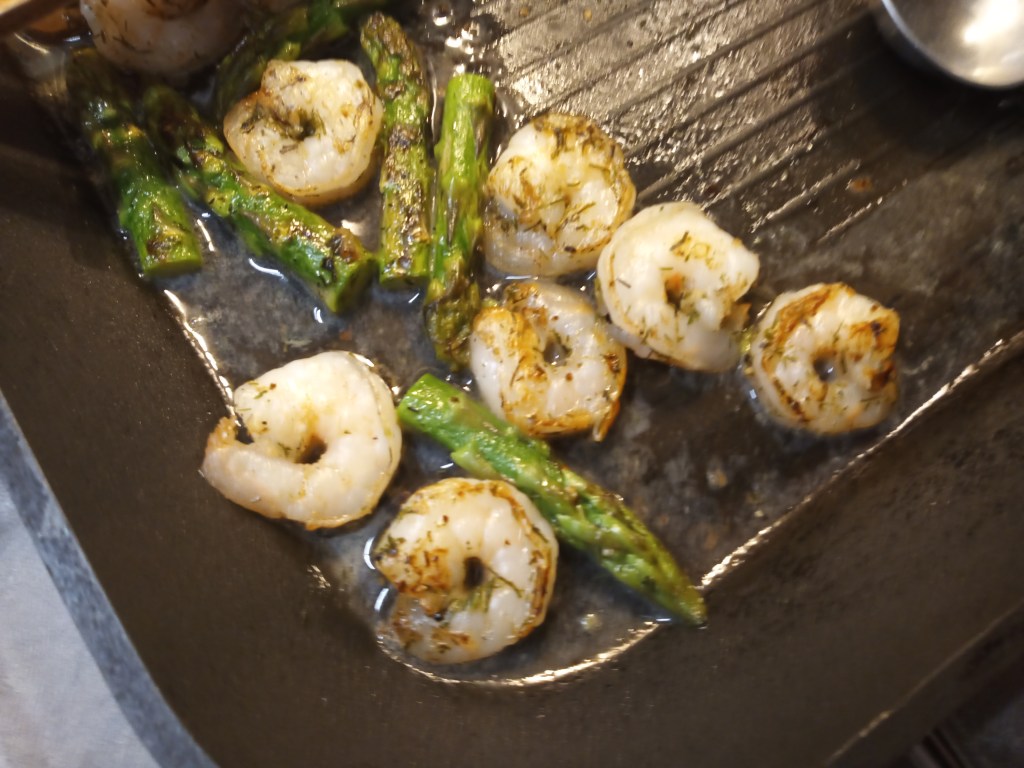 Verhit, wanneer de risotto bijna klaar is een gril pan de resterende olie. Als de pan goed heet is doe je de garnalen en asperge punten in de pan en laat ze grillen totdat de garnalen aan beide kanten goudbruin zijn. Blus de garnalen en aspergepunten met de Brandy (vis moet blijven zwemmen), maar je kan ze ook flamberen. Neem in dat geval niet een heel borrelglaasje, maar de helft. Voeg wat zout toe. Roer de roomboter, garnalen met asperges en eventueel de parmezaanse kaas nu door de risotto en bestrooi met zwarte peper. Doe de overgebleven brodo in een diepvries bakje en bewaar voor een volgende laatste keer.