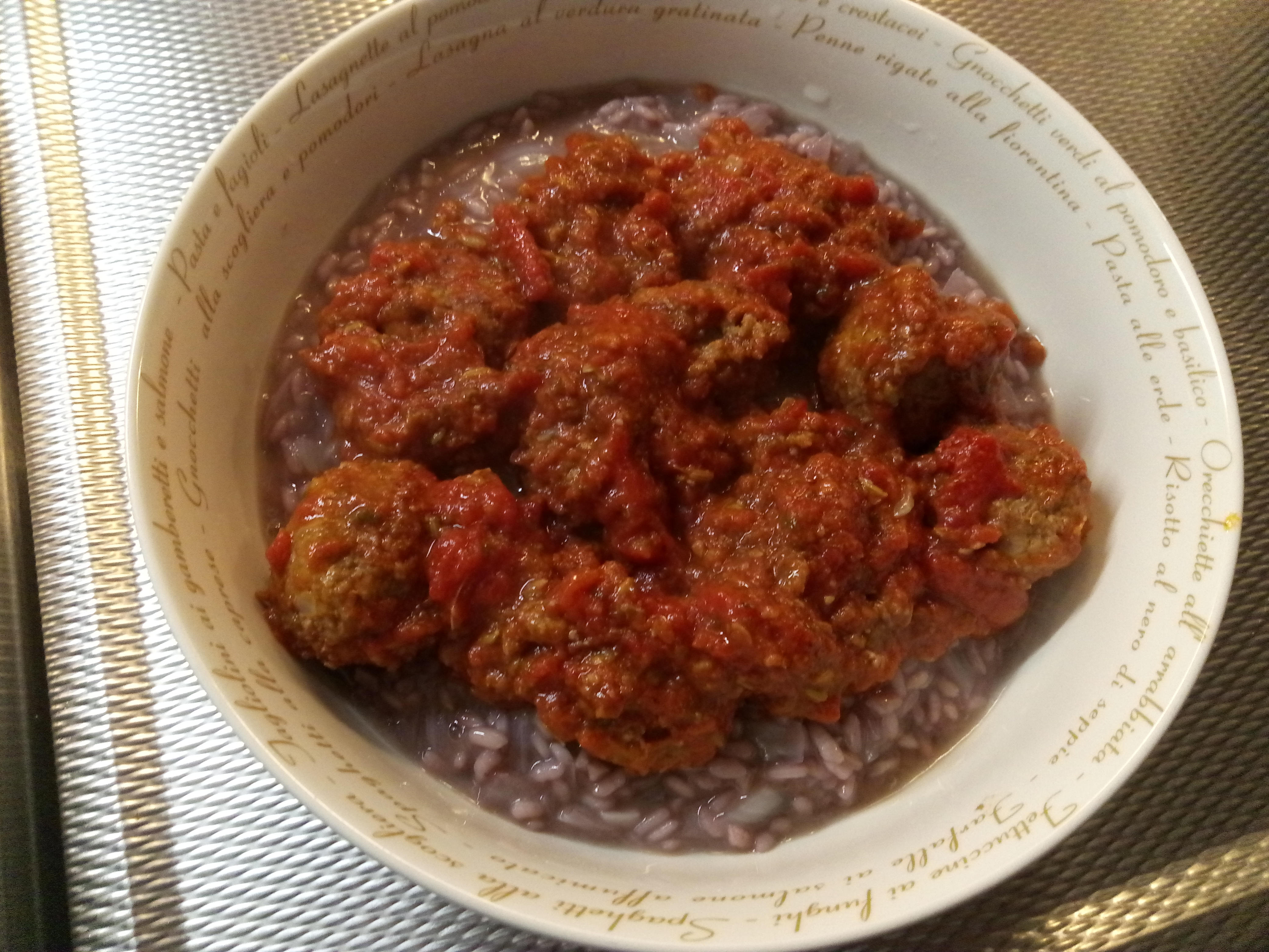 Voor de risotto: Verhit in een braadpan op matig vuur de olijfolie. Voeg de fijngesneden ui, knoflook erbij en bak totdat de ui glazig is, de knoflook begint te ruiken. Draai het vuur lager en voeg de risotto toe, zorg dat alle korrels bedekt zijn met de olie. Bak de risotto al roerend voor 2 min. Schenk de wijn erbij, laat verdampen en roer totdat hij helemaal door de risotto is opgenomen. Voeg nu beetje bij beetje de bouillon toe en roer regelmatig door. Doe dit voor ongeveer 20 min en voeg dan een klontje roomboter toe. Laat de riso de roomboter tot zich nemen, voeg peper en zout naar smaak toe. Doe de risotto over in een voorverwarmde schaal, voeg de gehaktballetjes toe en roer een beetje door en als laatste de saus erover, strooi de gescheurde basilicumblaadjes of gedroogde erover en serveer meteen.