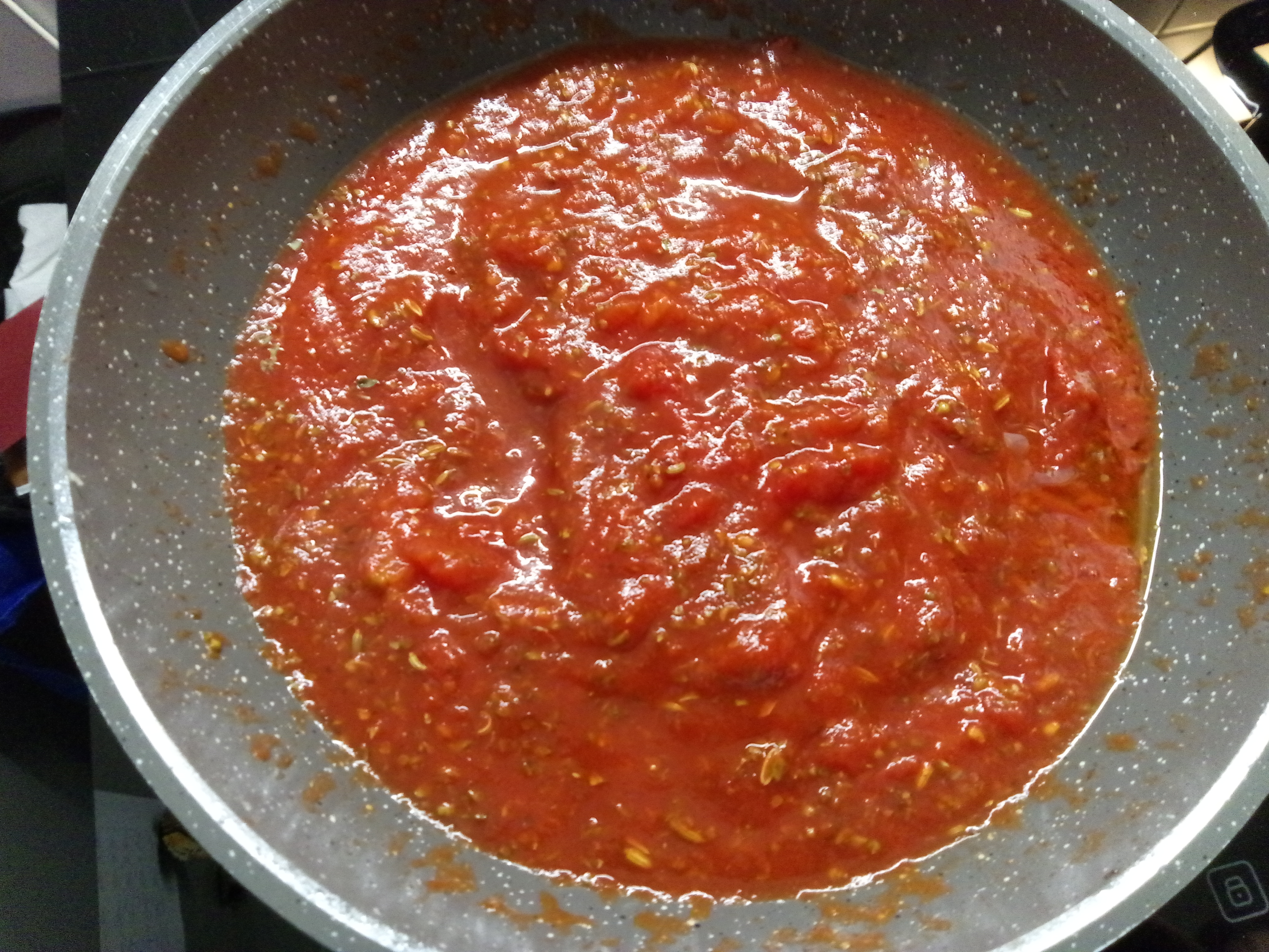 Voor de saus: doe in dezelfde pan nog een beetje olie. Maak warm en voeg de tomatenpuree, oregano, venkelzaad, zwarte peper en de tomaat uit blik of de in stukjes gesneden tomaat toe.