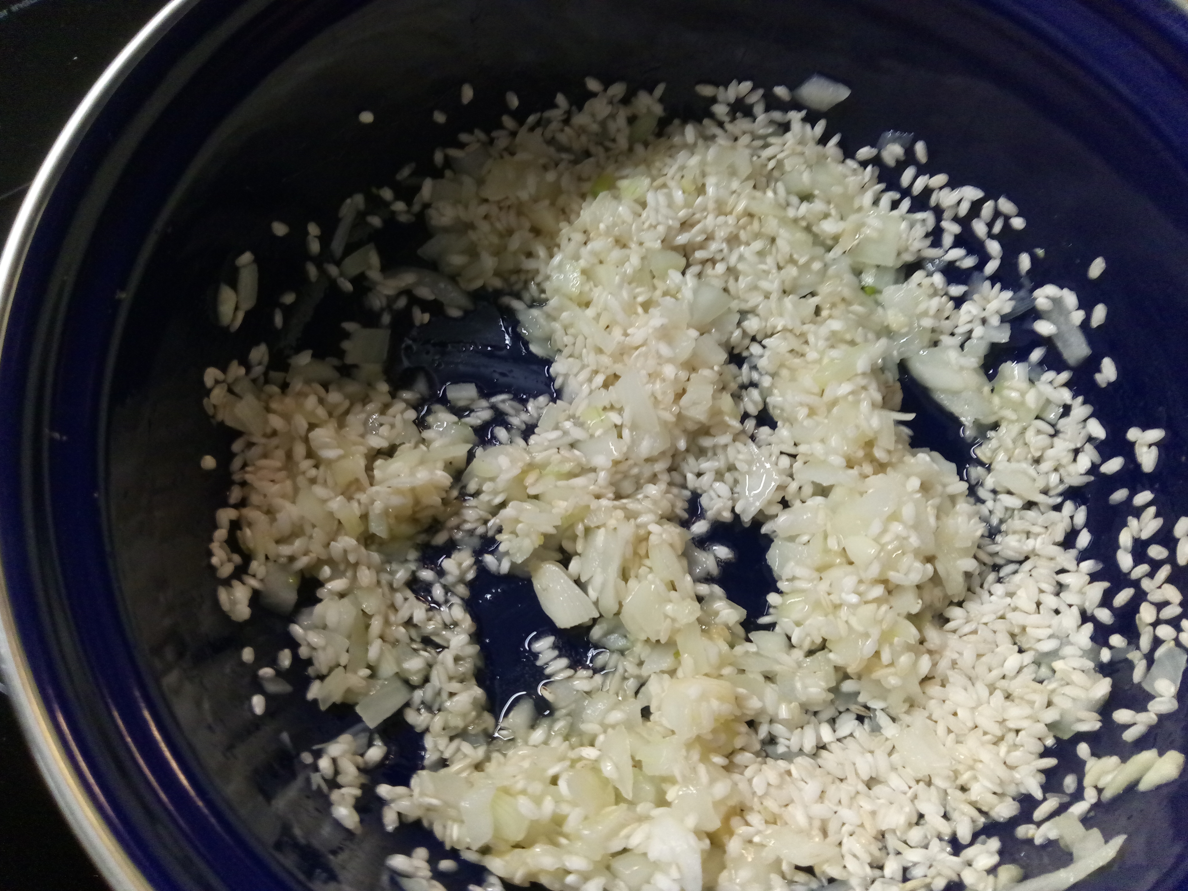 Voor de risotto: olijfolie, 1 klontje roomboter, 1 ui, 1 knoflook, 300 gr Arborio risotto, 1 glas rode wijn, 1 ltr runder brodo (zelf gemaakte of alleen water met bouillonblokje), peper, zout, basilicum blaadjes (mag ook gedroogd)