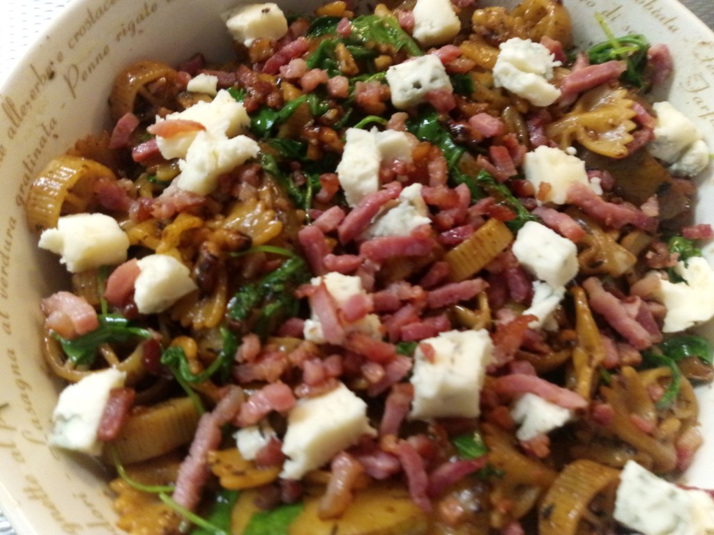 Ondertussen is de pasta al dente en voeg die toe bij de peer en walnoten. Roer met liefde door elkaar. Warm op een laag vuurtje terwijl je de rucola erbij doet en doe de helft van de pancetta en de Gorgonzola erdoor. Schep alles rustig door elkaar zodat de pasta de Gorgonzola en walnoot pancetta mengsel tot zich neemt. Doe over in een mooie schaal en garneer met de rest van de pancetta en Gorgonzola.