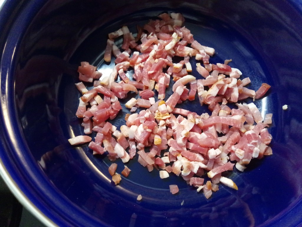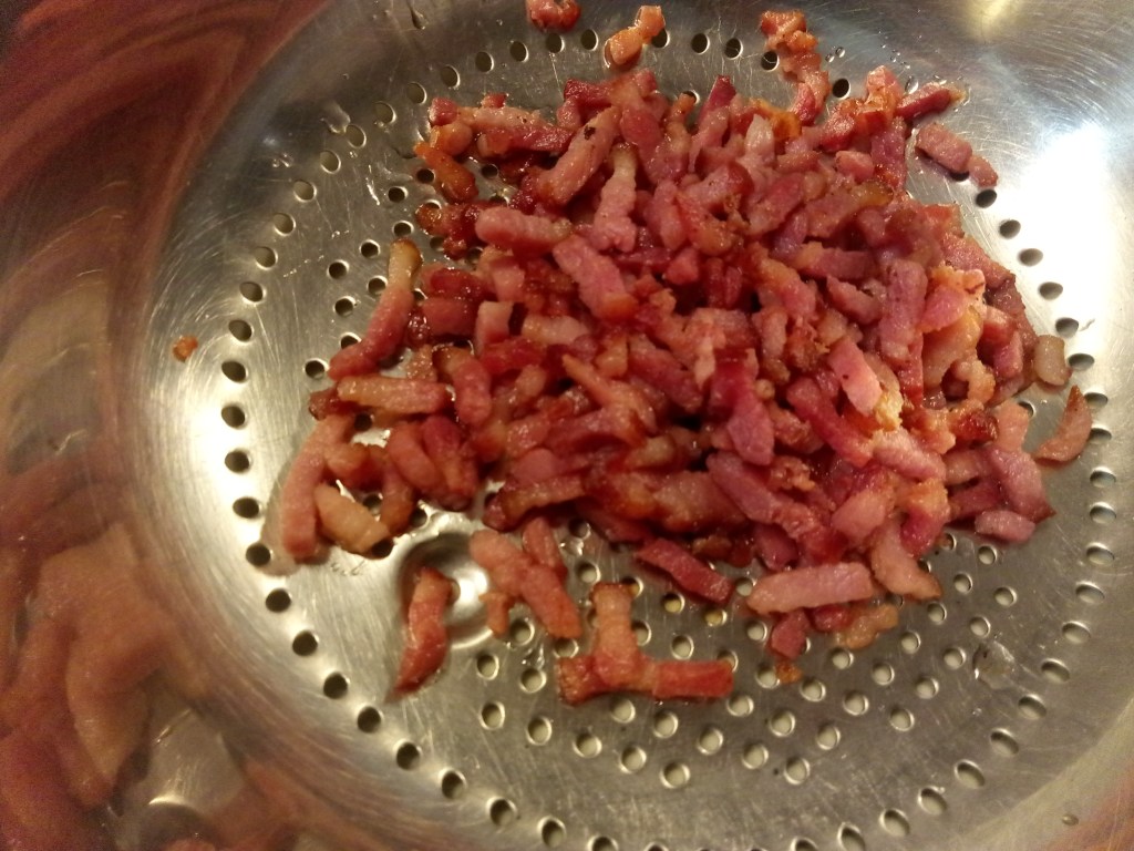Kook de pasta volgens de verpakking al dente. Verhit ondertussen een braadpan op middelhoog vuur. Zet het vuur lager zodra de pan heet is en bak er de blokjes pancetta voor 2-3 min. Haal de pancetta uit de pan en zet apart, laat uitlekken.