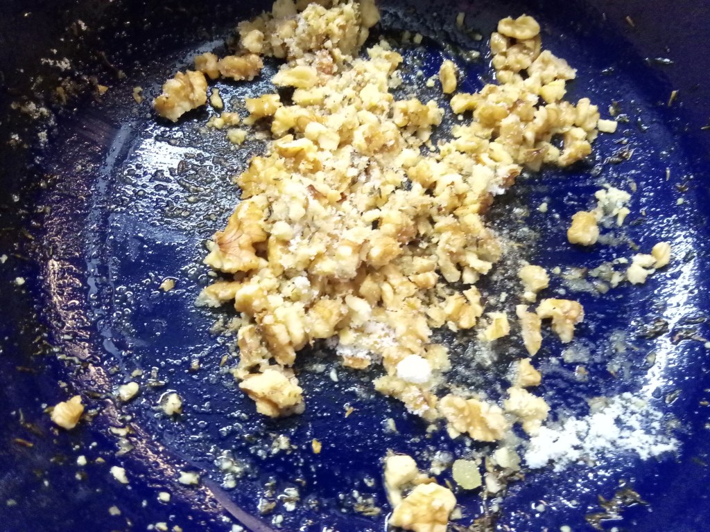 Maal de walnoten fijn en doe die in dezelfde pan (met het lekkere bakvocht van de peer en de pancetta) en strooi de suiker erover. Bak tot de suiker gesmolten is, doe de plakjes peer er weer bij en roer voorzichtig om ze te omhullen met een laagje karamel.