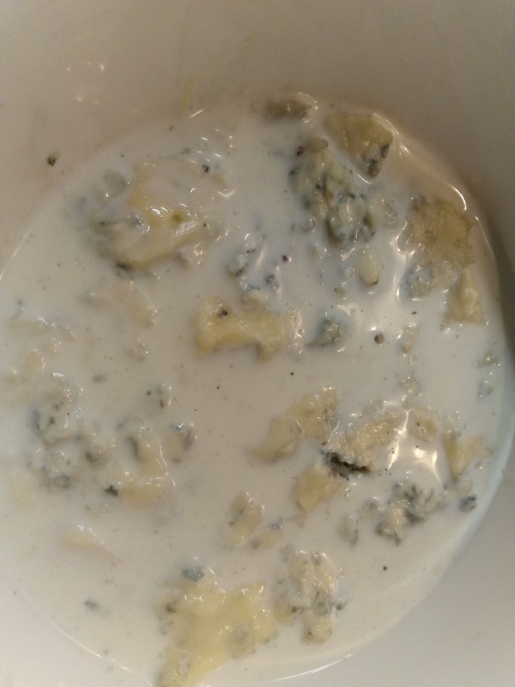 500 gr Gorgonzola (of andere blauwe kaas), 1 glas melk, 4 eidooiers, roomboter, zout en zwarte peper