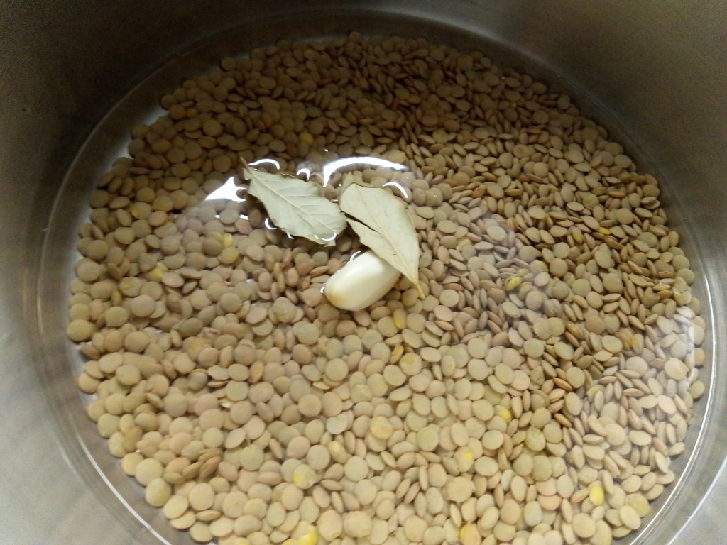 Voor de Linzen: 200 gr lenticchie di Castelluccio of linzen uit Le Puy, 2 knoflook, 2 laurierblaadjes, handvol verse bladpeterselie, balsamico, tijm