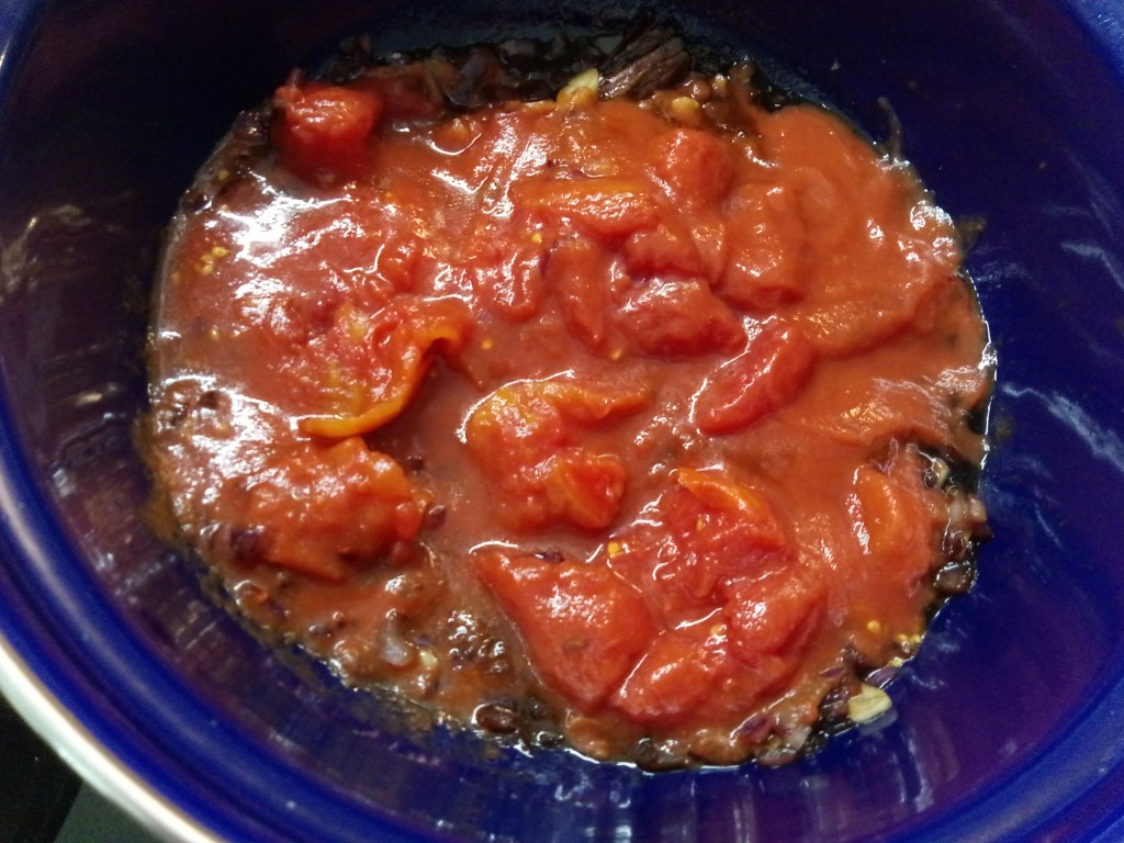 Voor de Salsa Rossa: olijfolie, 1 rode ui, 2 knoflook, 1 halve kaneelstokje, handvol verkruimelde peperoncino, 2 el balsamico, 1 blik van 400 gr tomatenblokjes (of 1 blik hele tomaten die je later fijn maakt)